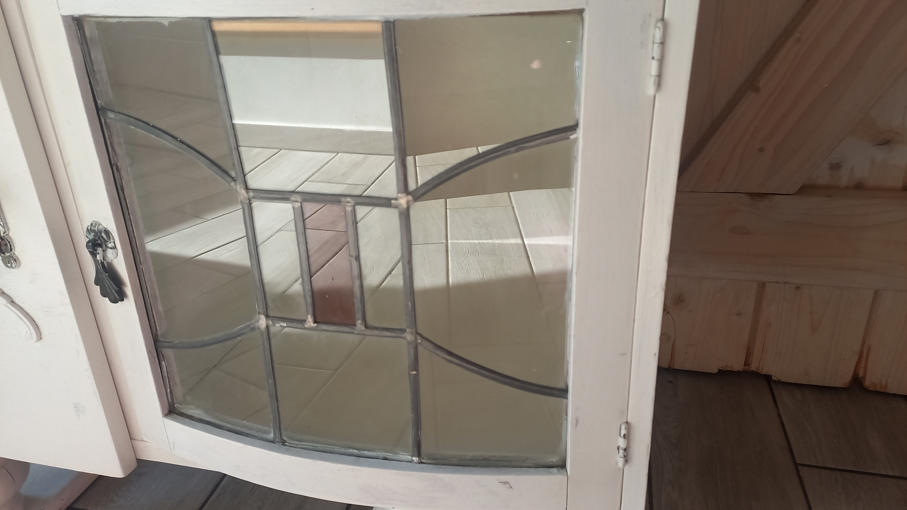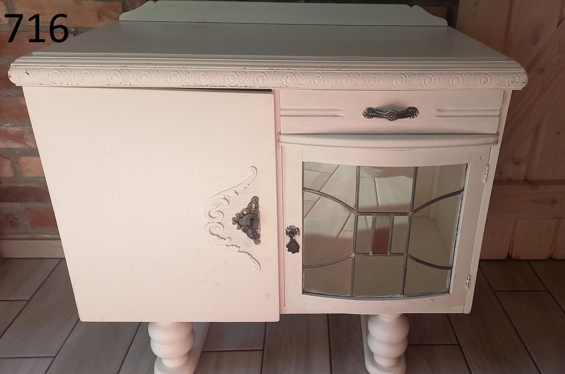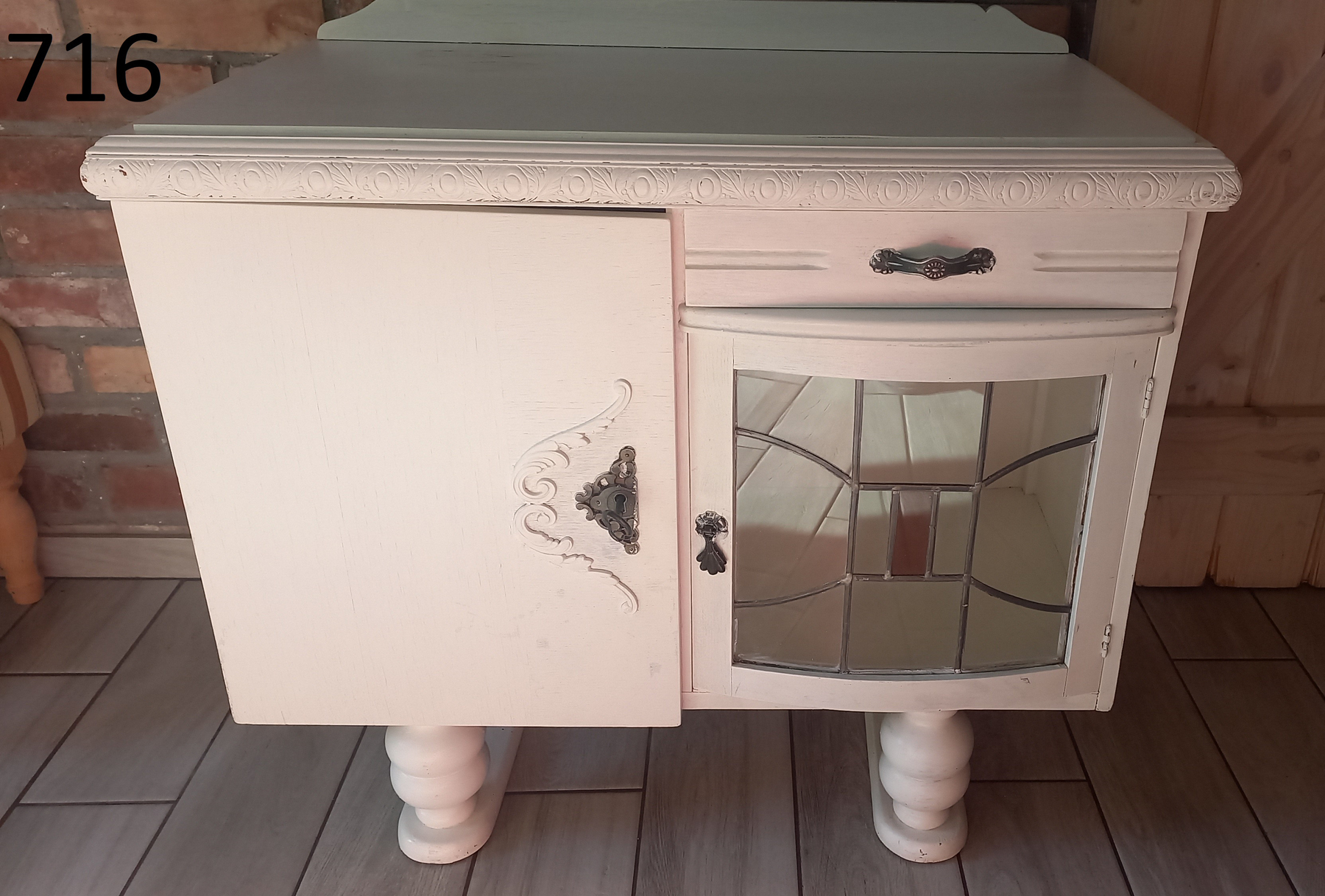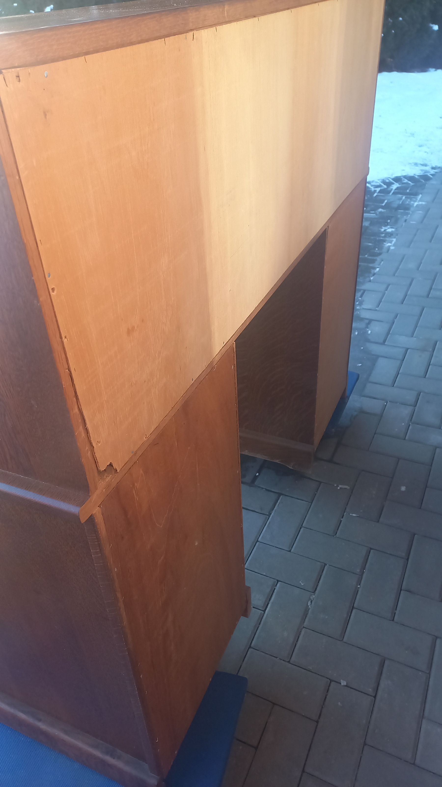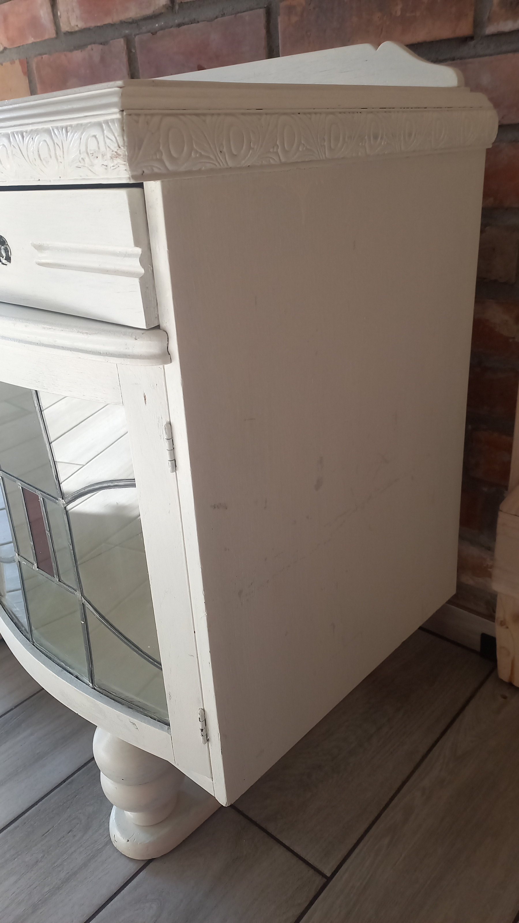 Stara komoda wykonana z drewna oraz sklejki fornirowanej. Na meblu widnieją ślady użytkowania pokazane na zdjęciach. Szybki witrażowe w drzwiczkach są całe. Wewnątrz komody utrzymuje się woń starości (stęchlizna).
