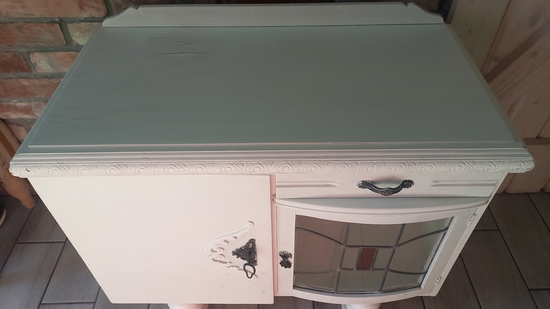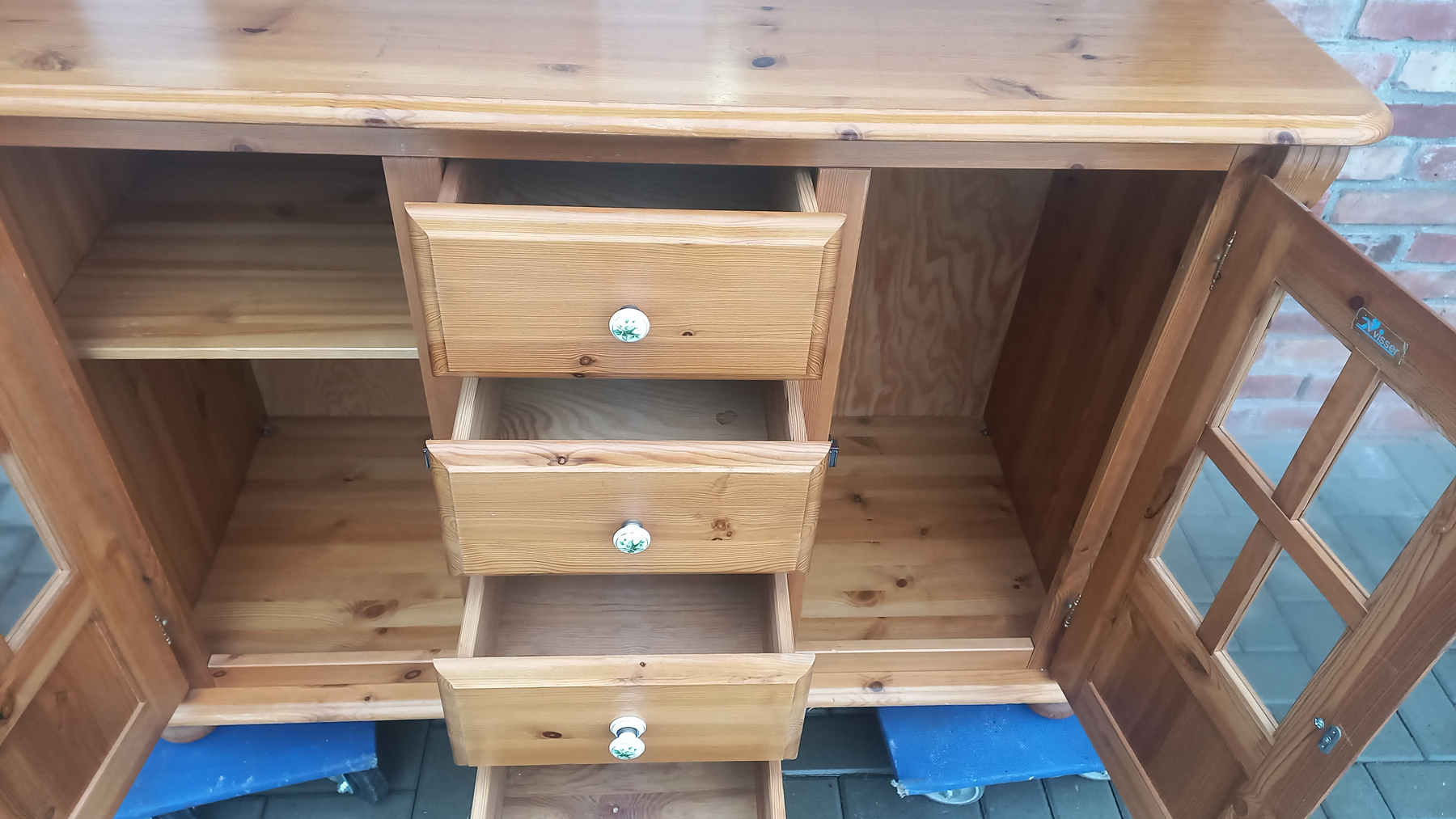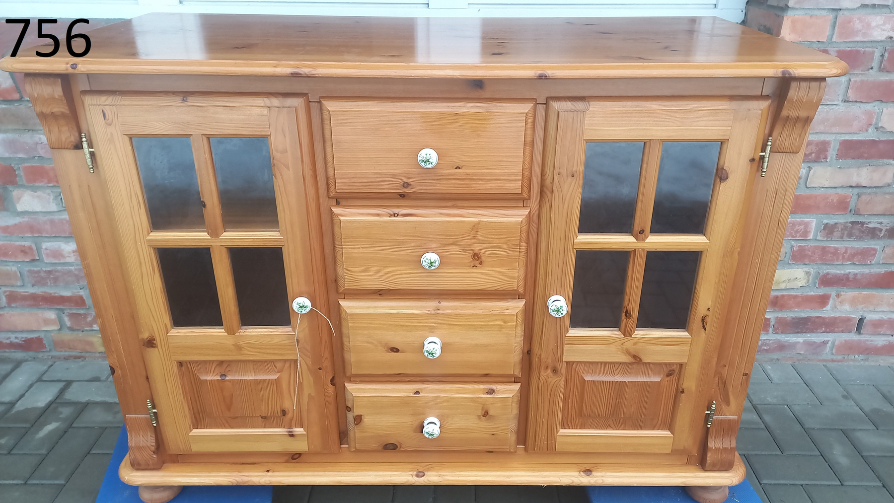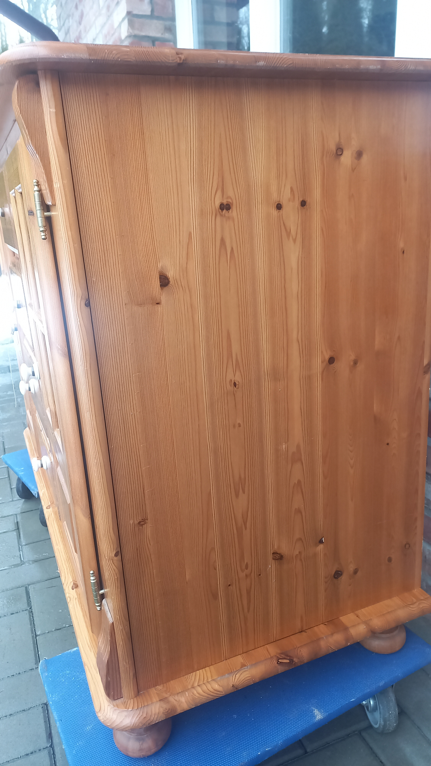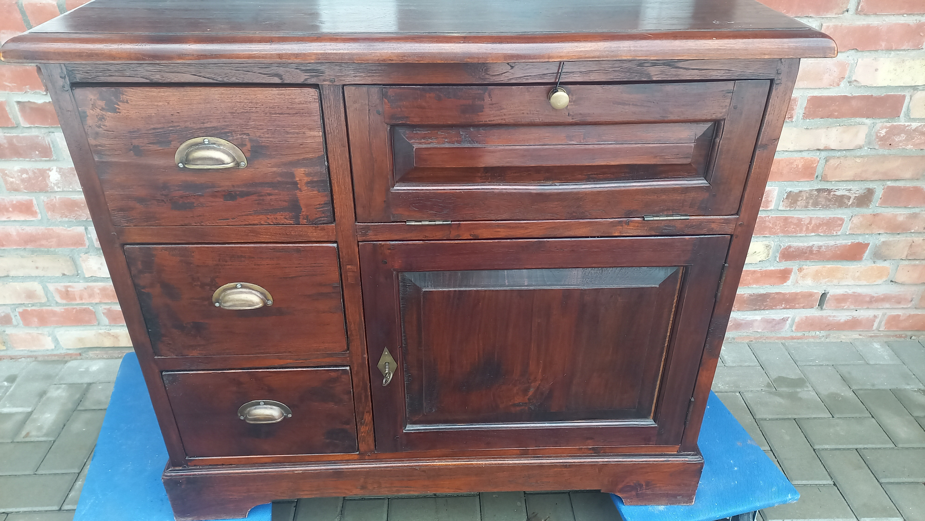 Stara komoda wykonana z drewna oraz sklejki fornirowanej. Na meblu widnieją ślady użytkowania pokazane na zdjęciach. Szybki witrażowe w drzwiczkach są całe. Wewnątrz komody utrzymuje się woń starości (stęchlizna).