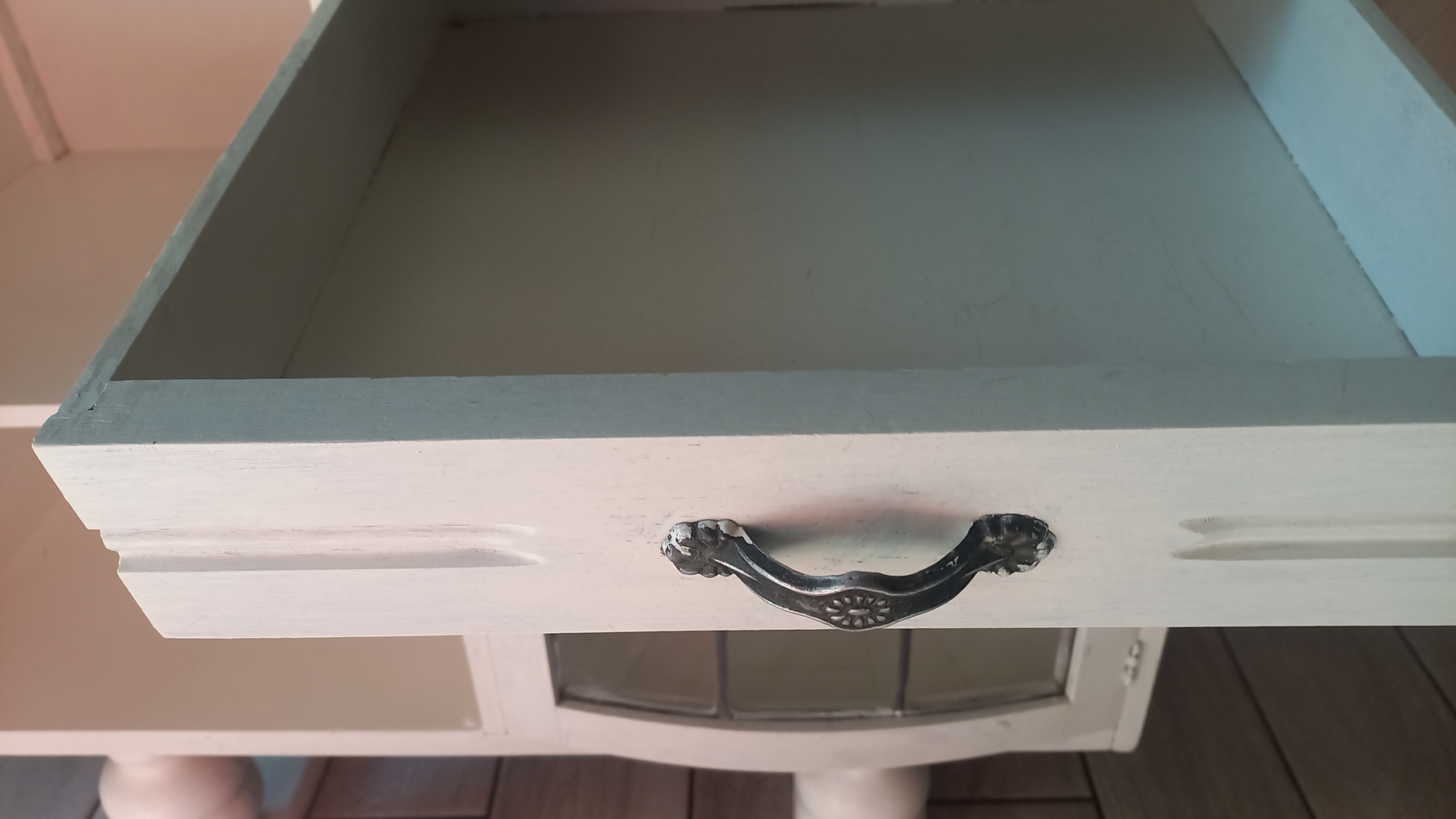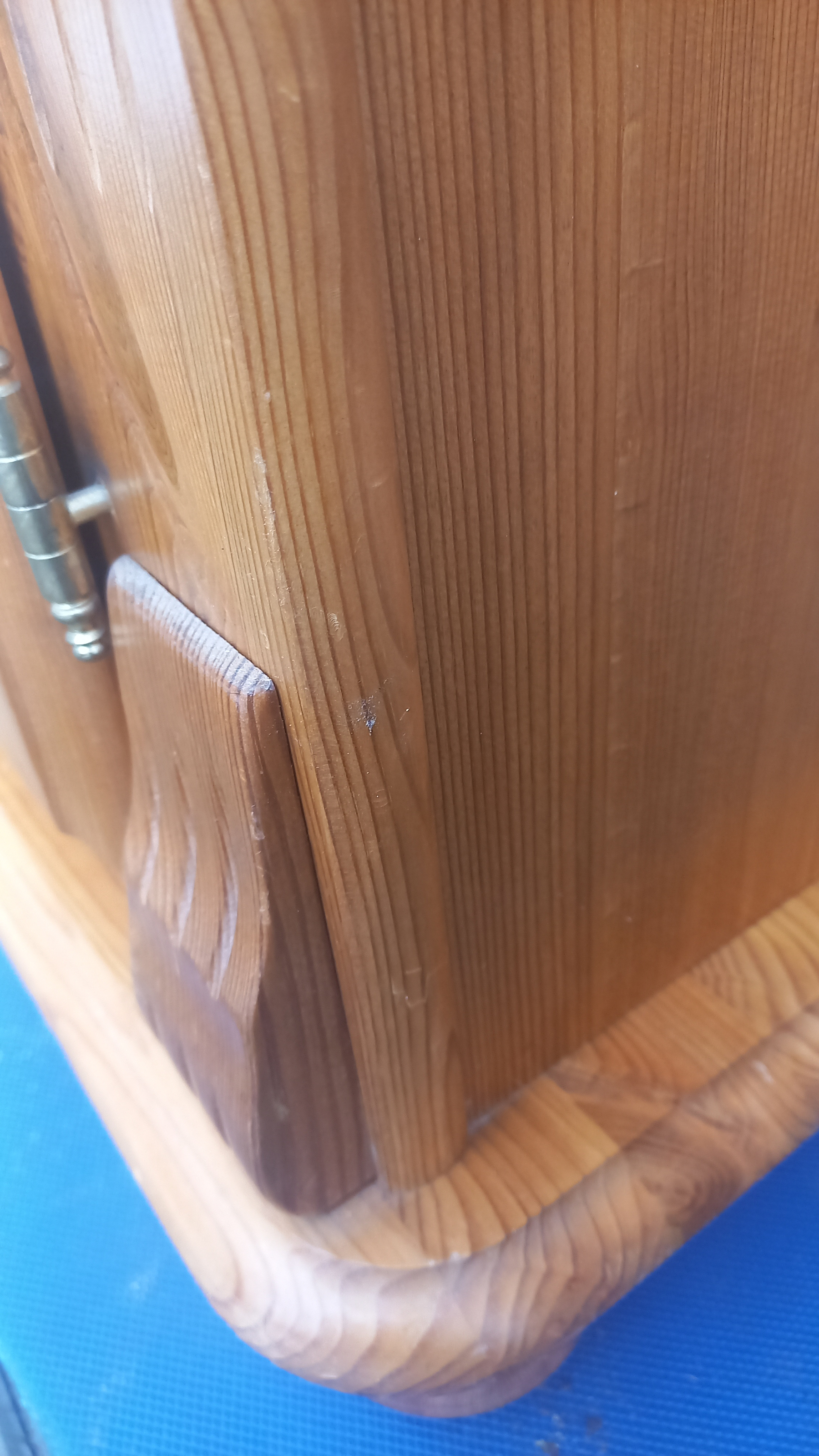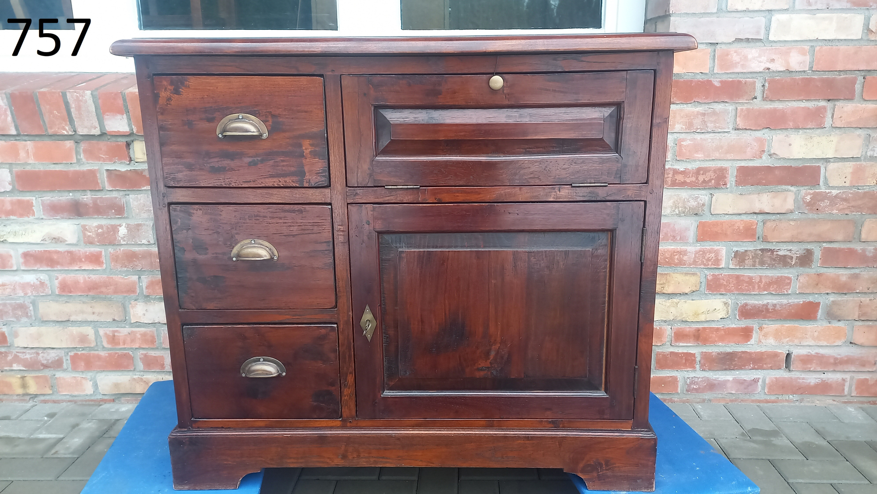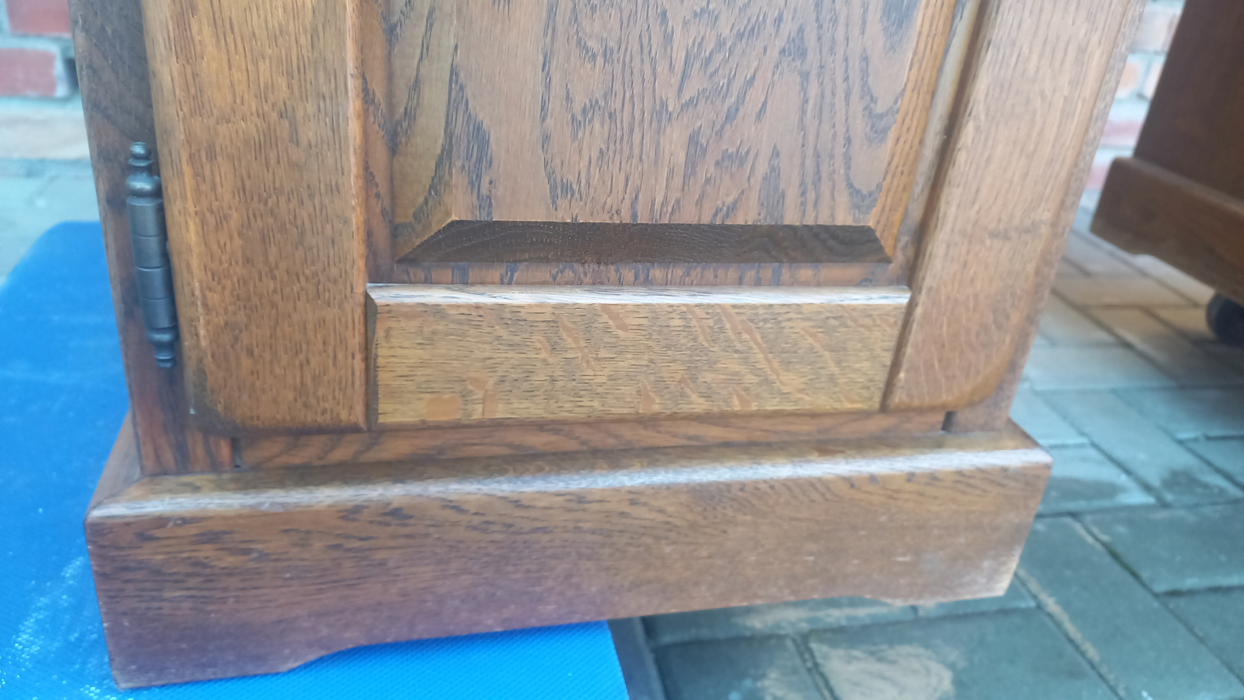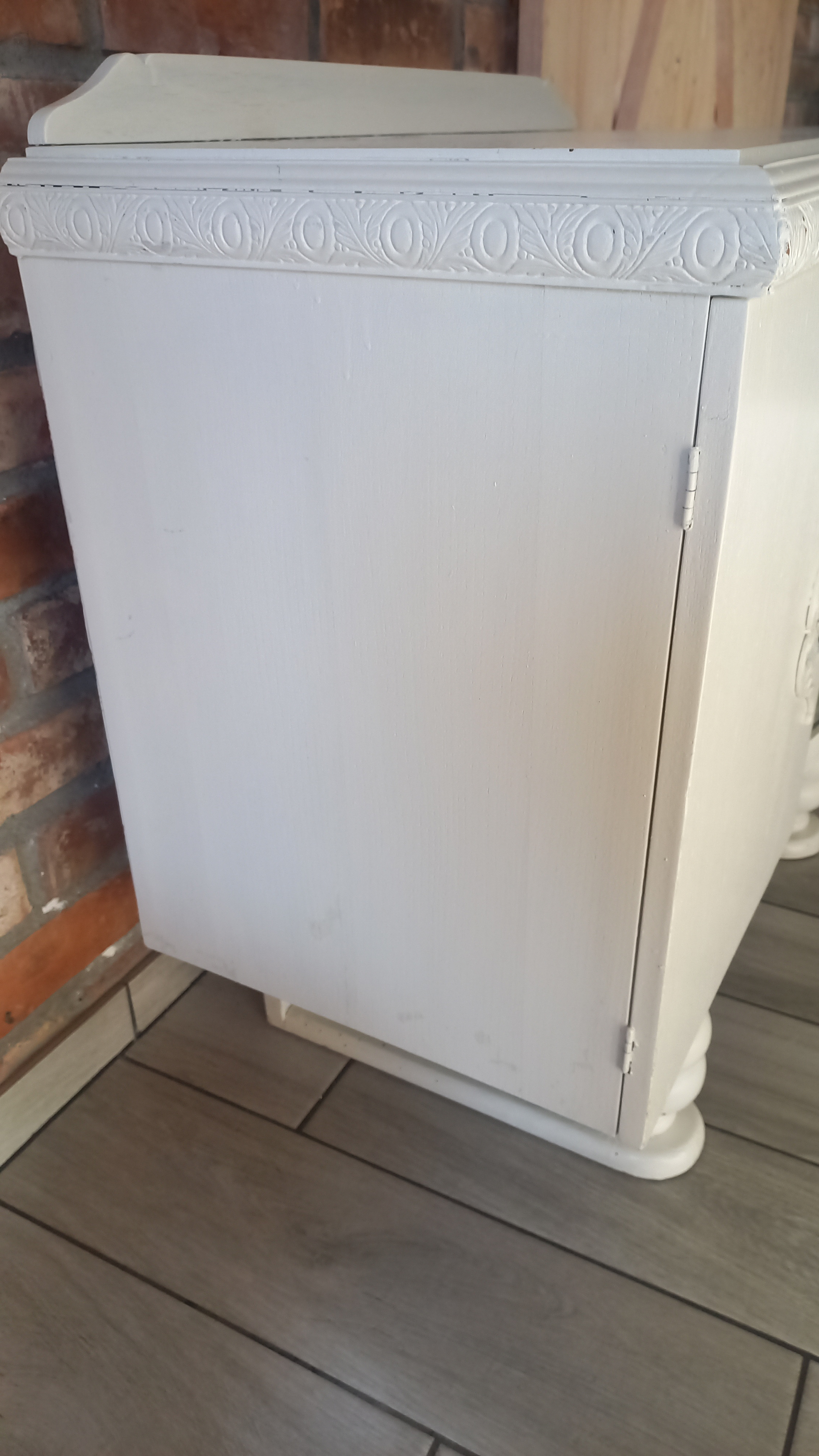 Stara komoda wykonana z drewna oraz sklejki fornirowanej. Na meblu widnieją ślady użytkowania pokazane na zdjęciach. Szybki witrażowe w drzwiczkach są całe. Wewnątrz komody utrzymuje się woń starości (stęchlizna).