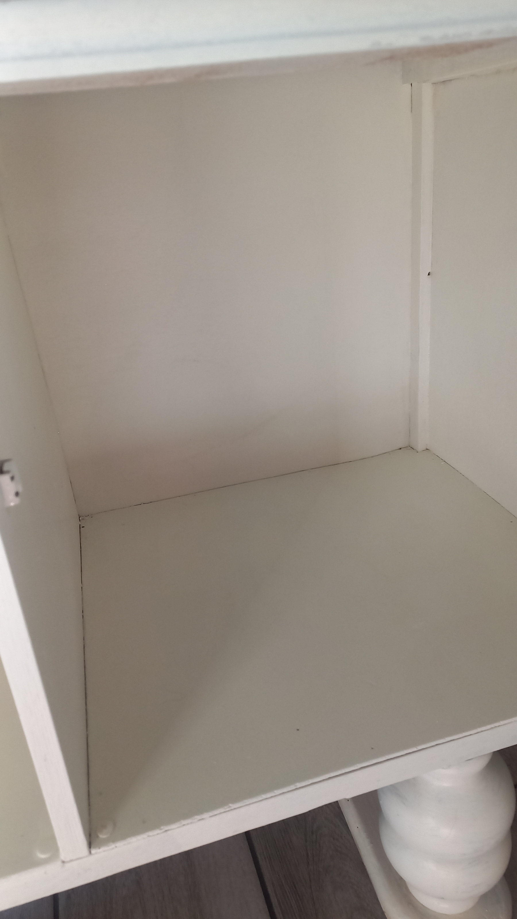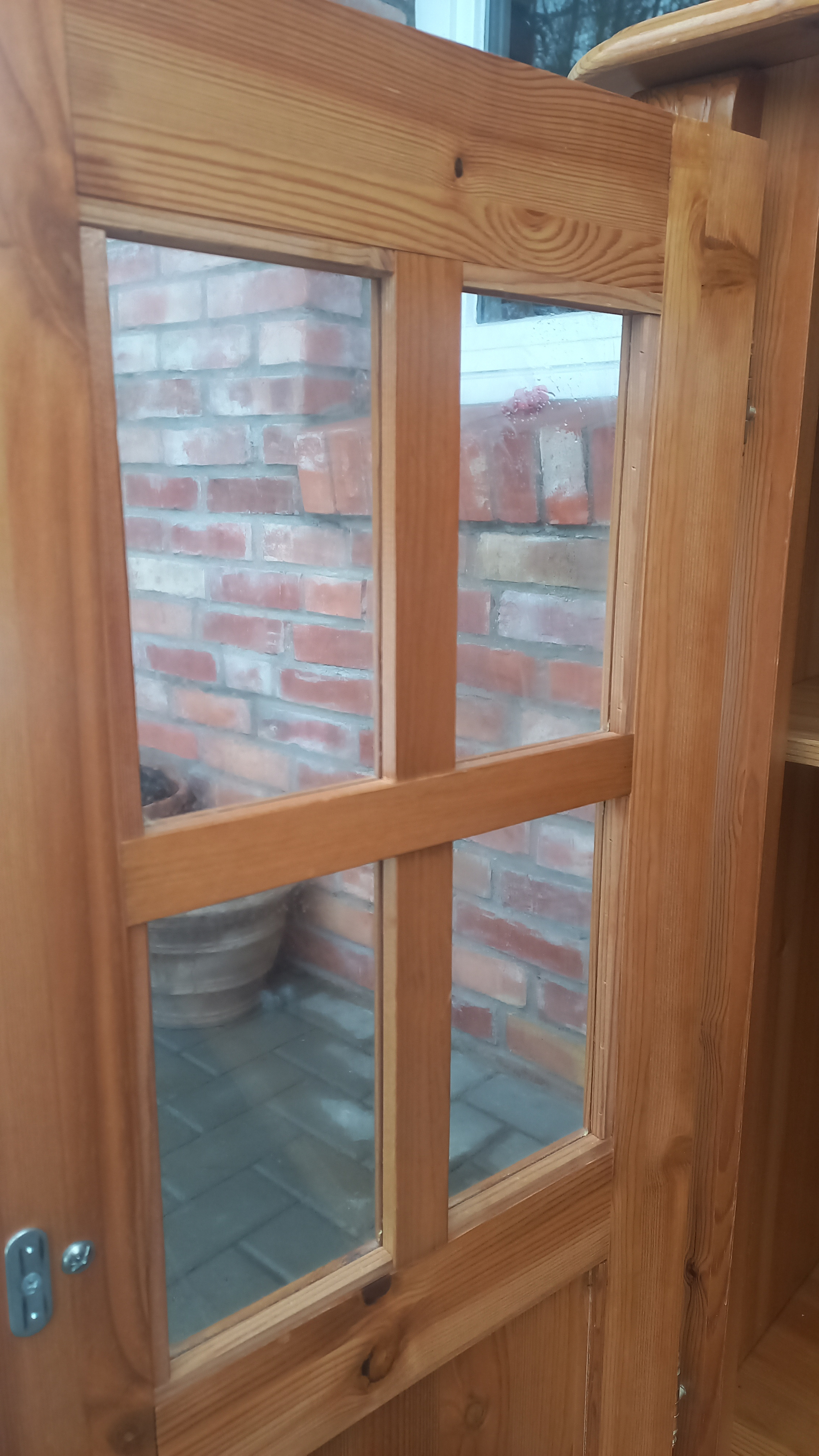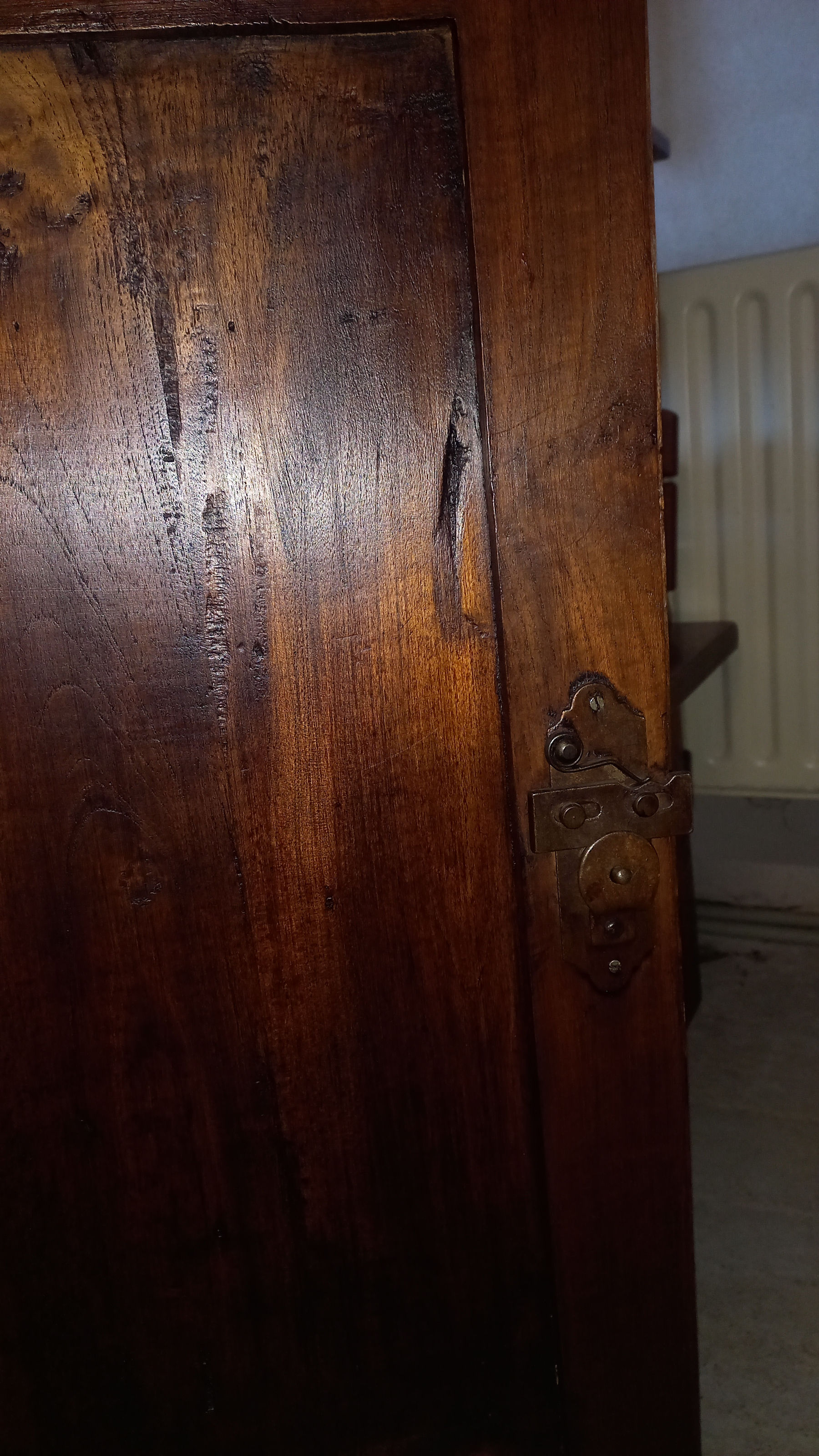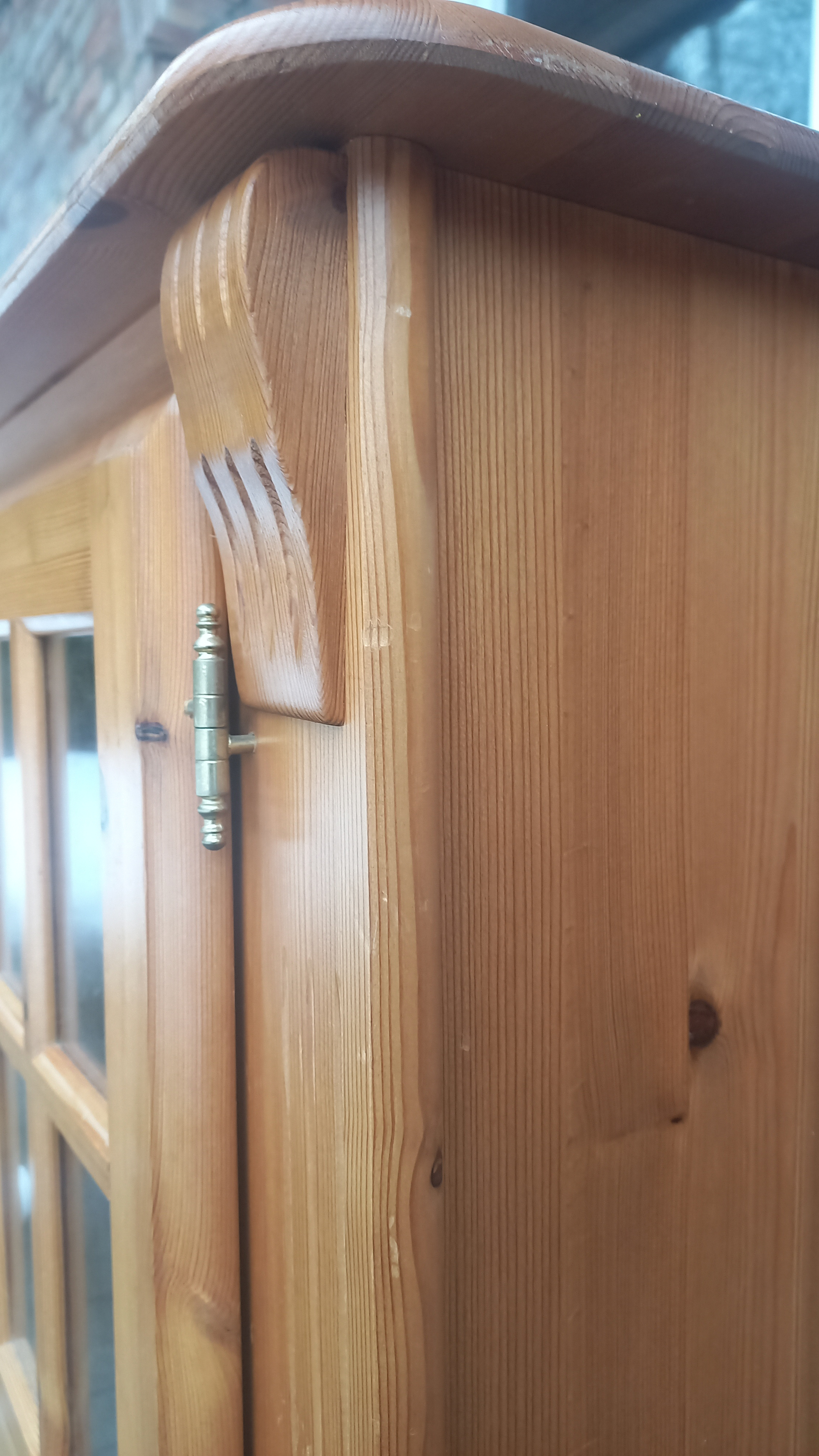 Stara komoda wykonana z drewna oraz sklejki fornirowanej. Na meblu widnieją ślady użytkowania pokazane na zdjęciach. Szybki witrażowe w drzwiczkach są całe. Wewnątrz komody utrzymuje się woń starości (stęchlizna).