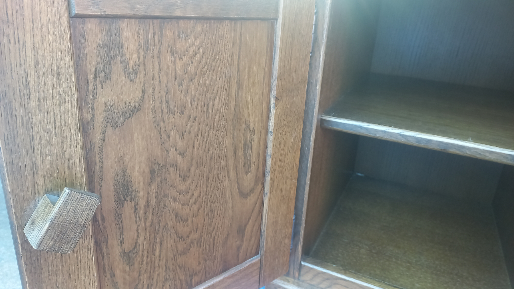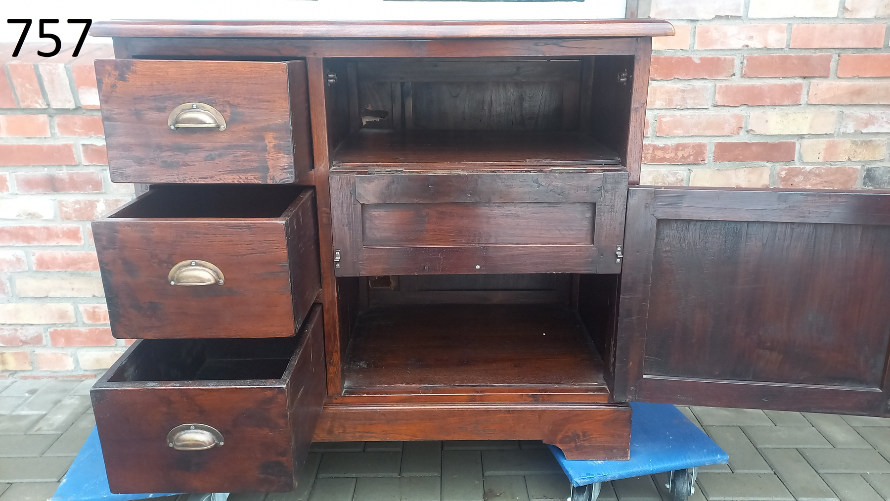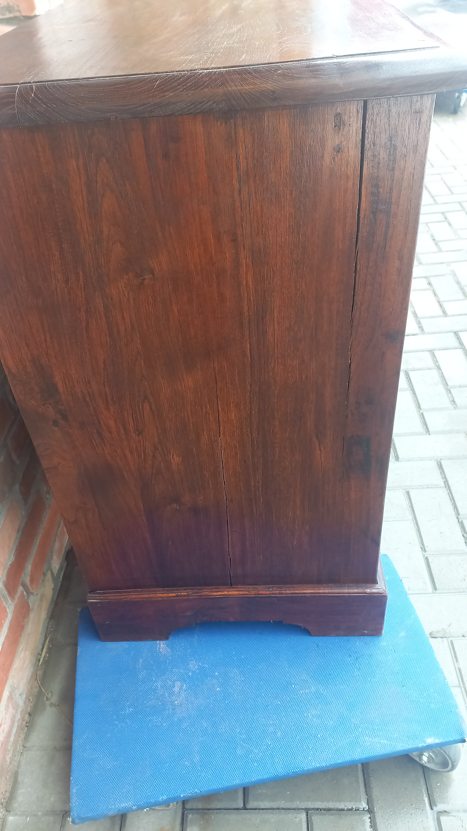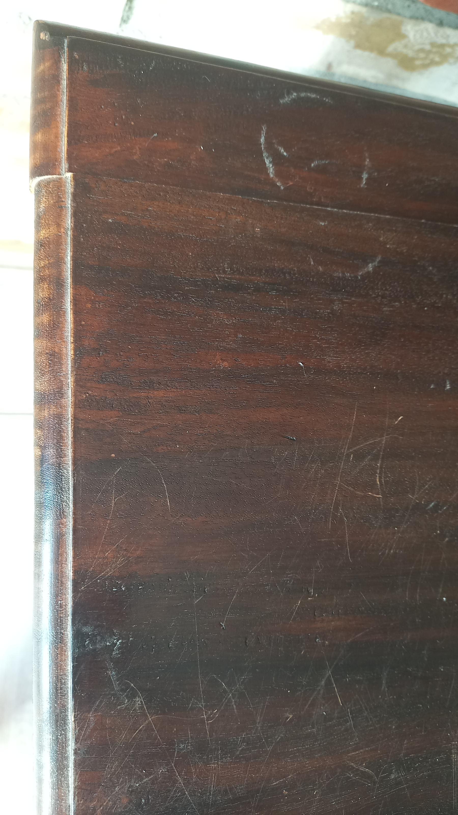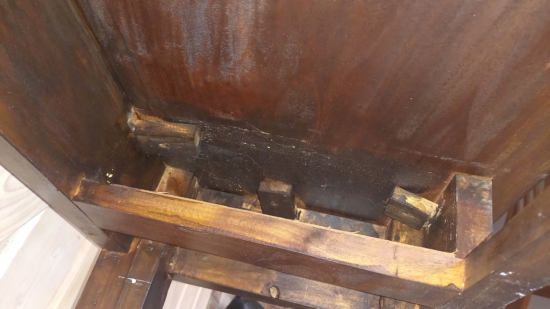 Stara komoda wykonana z drewna oraz sklejki fornirowanej. Na meblu widnieją ślady użytkowania pokazane na zdjęciach. Szybki witrażowe w drzwiczkach są całe. Wewnątrz komody utrzymuje się woń starości (stęchlizna).