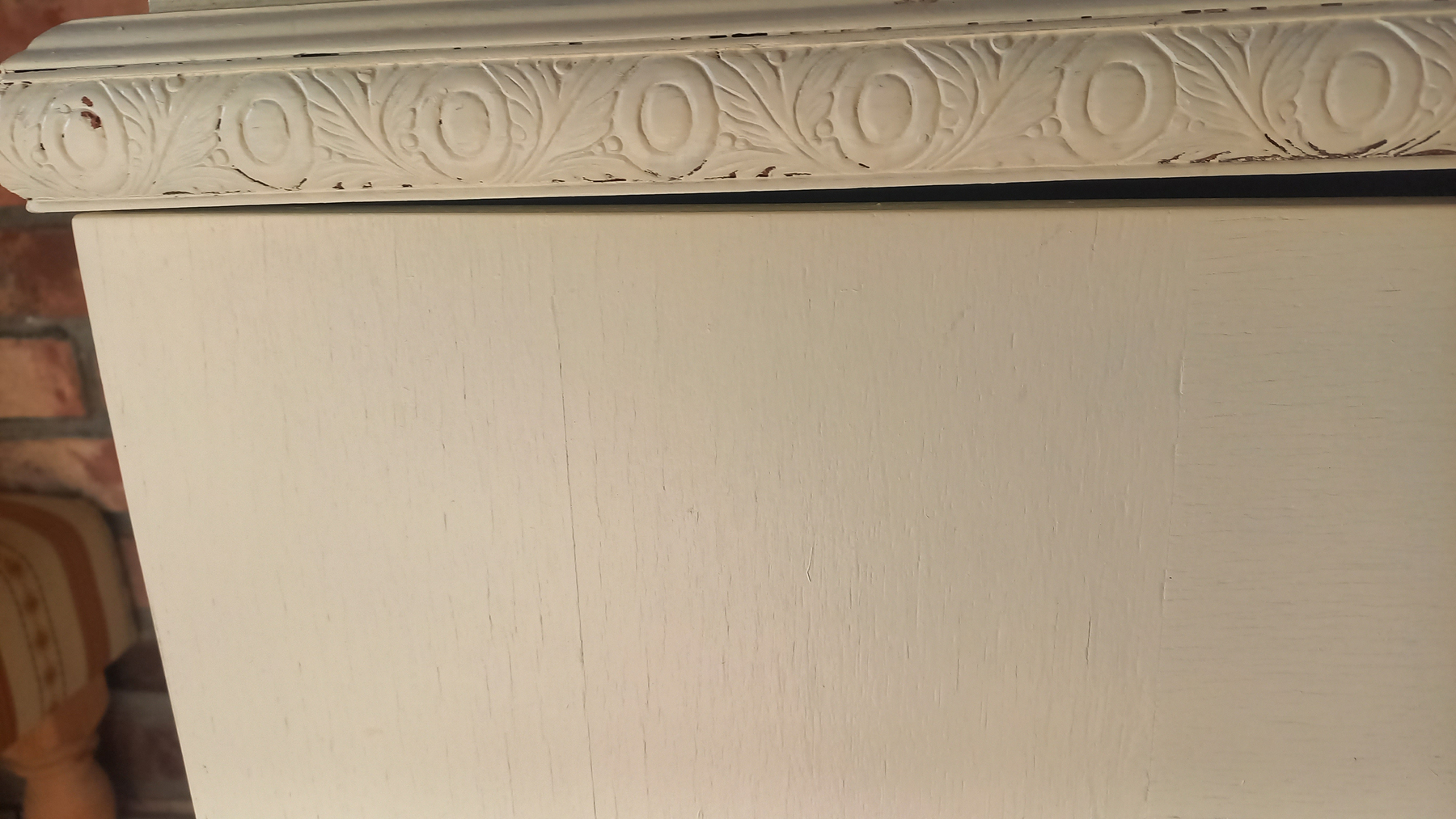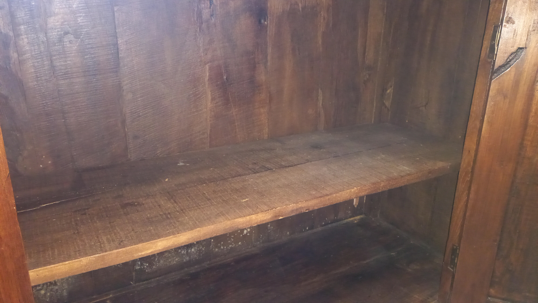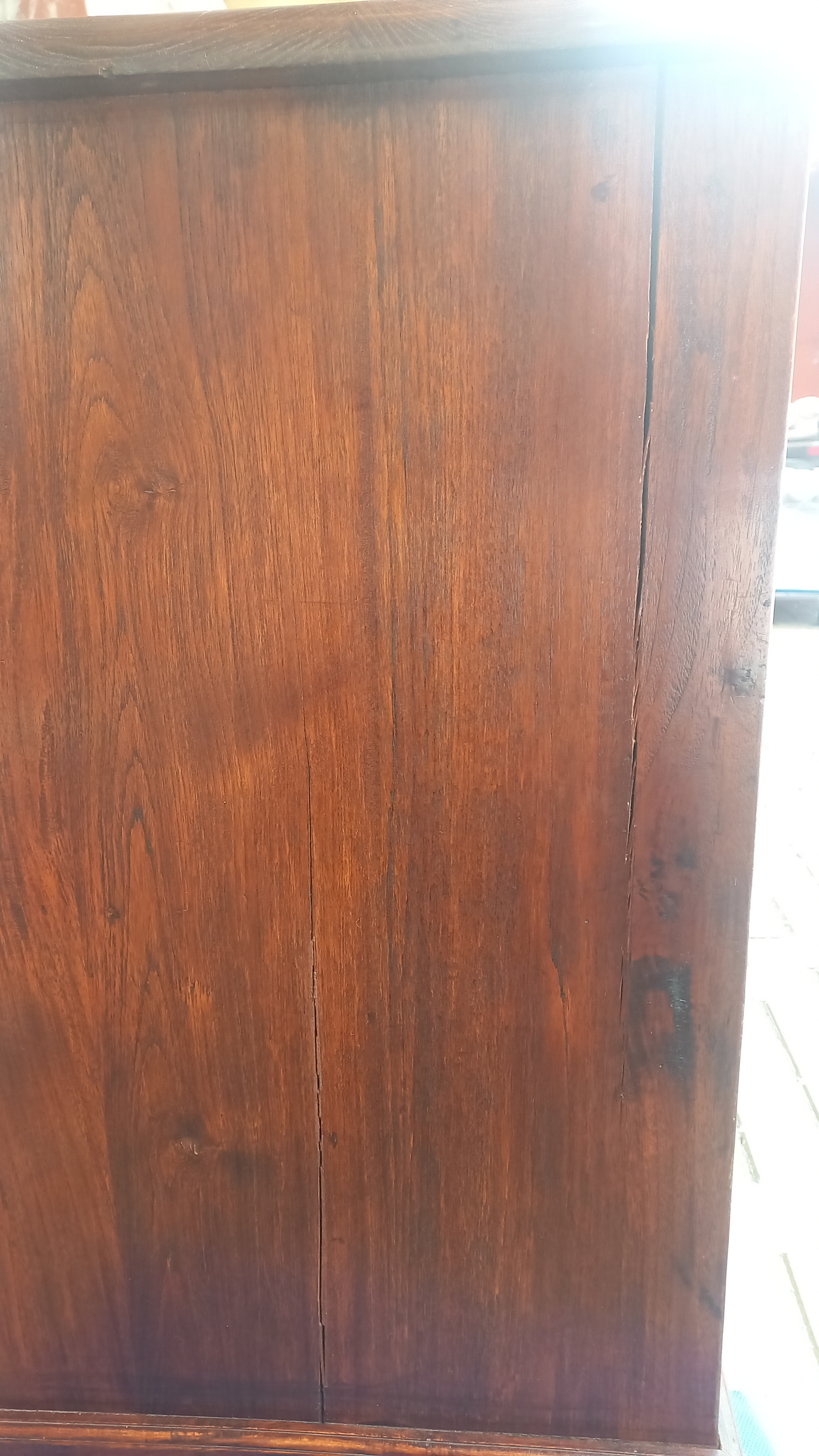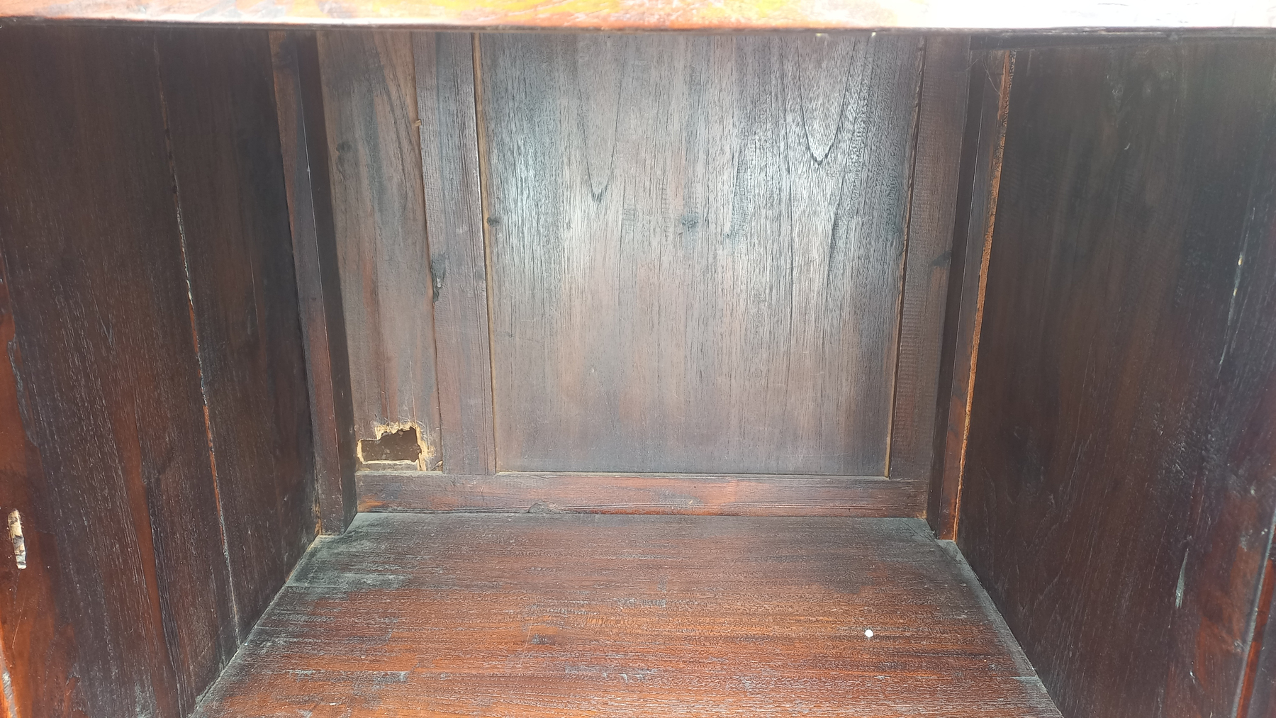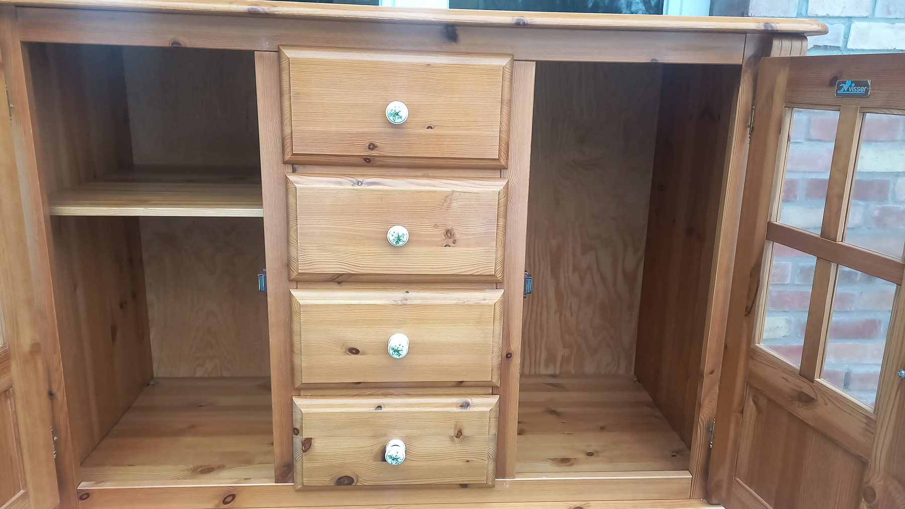 Stara komoda wykonana z drewna oraz sklejki fornirowanej. Na meblu widnieją ślady użytkowania pokazane na zdjęciach. Szybki witrażowe w drzwiczkach są całe. Wewnątrz komody utrzymuje się woń starości (stęchlizna).