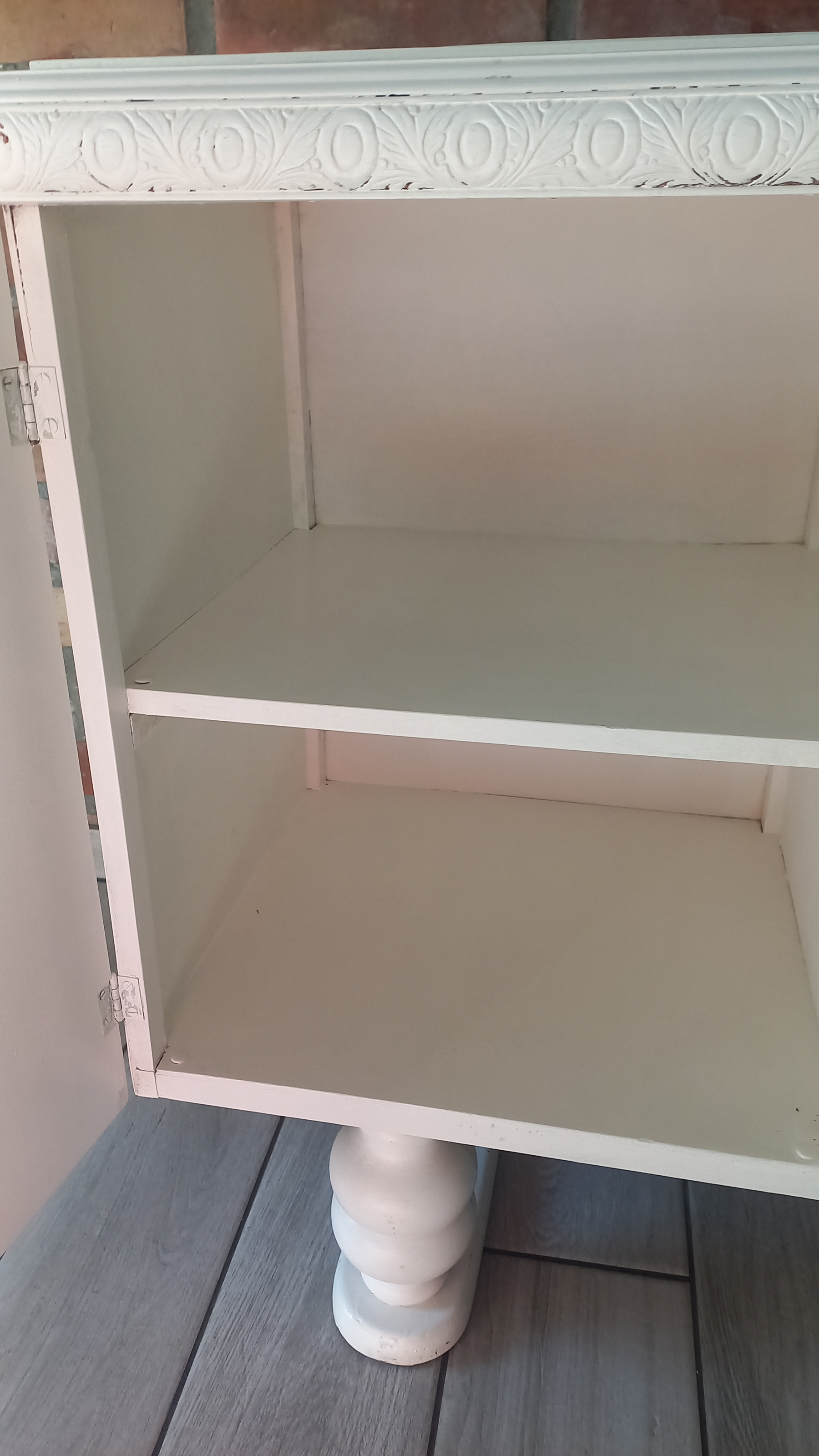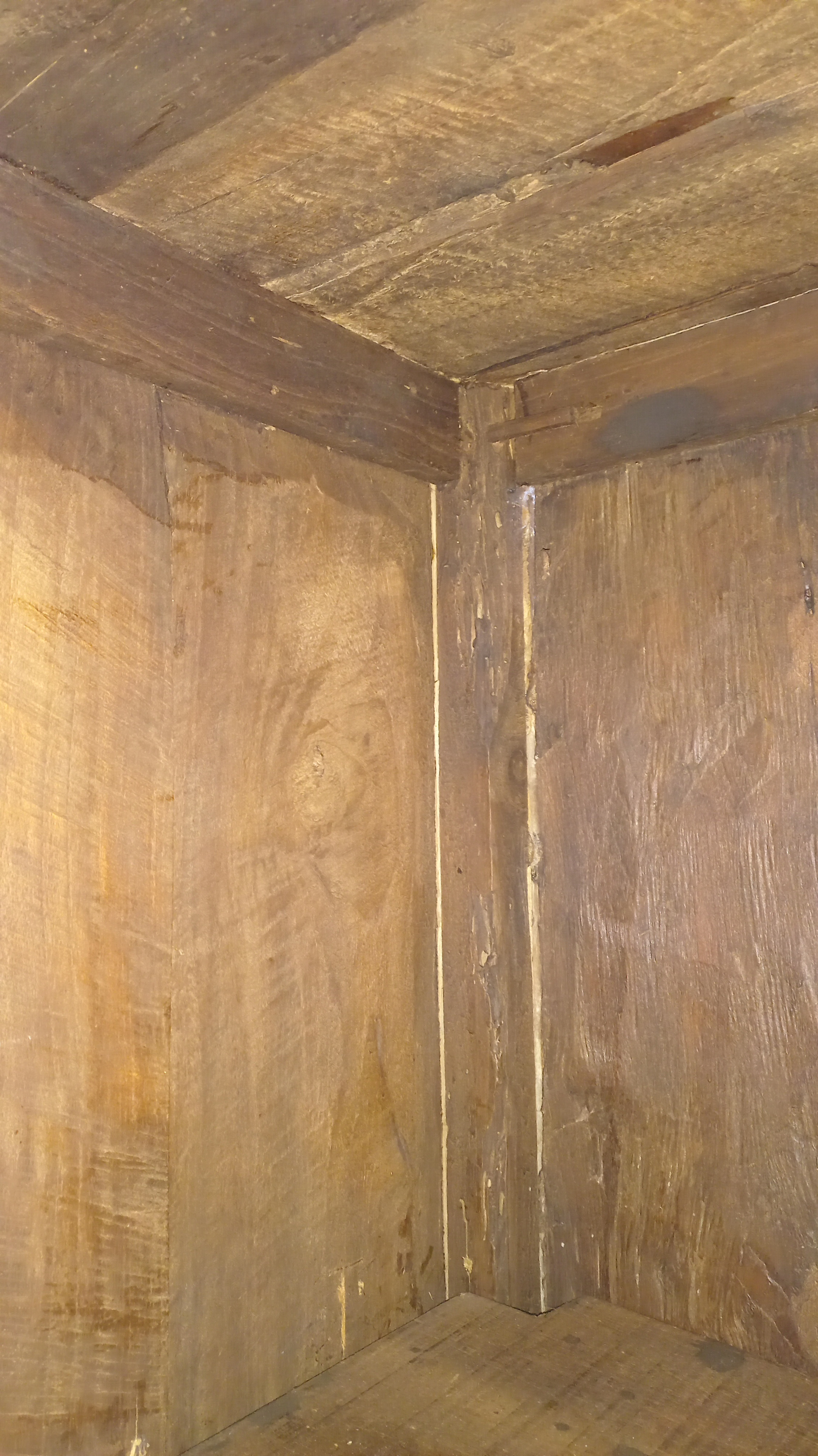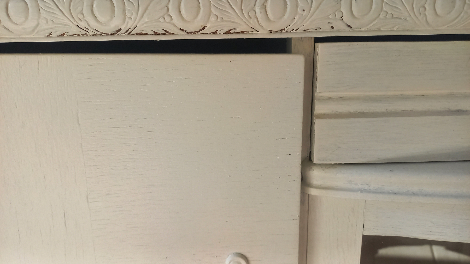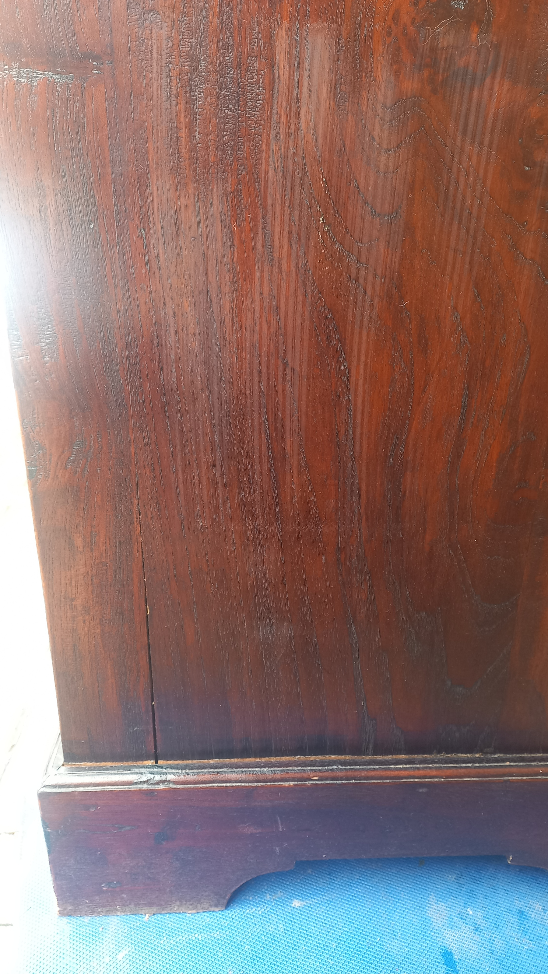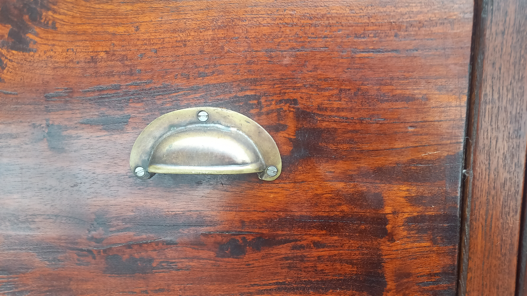Stara komoda wykonana z drewna oraz sklejki fornirowanej. Na meblu widnieją ślady użytkowania pokazane na zdjęciach. Szybki witrażowe w drzwiczkach są całe. Wewnątrz komody utrzymuje się woń starości (stęchlizna).