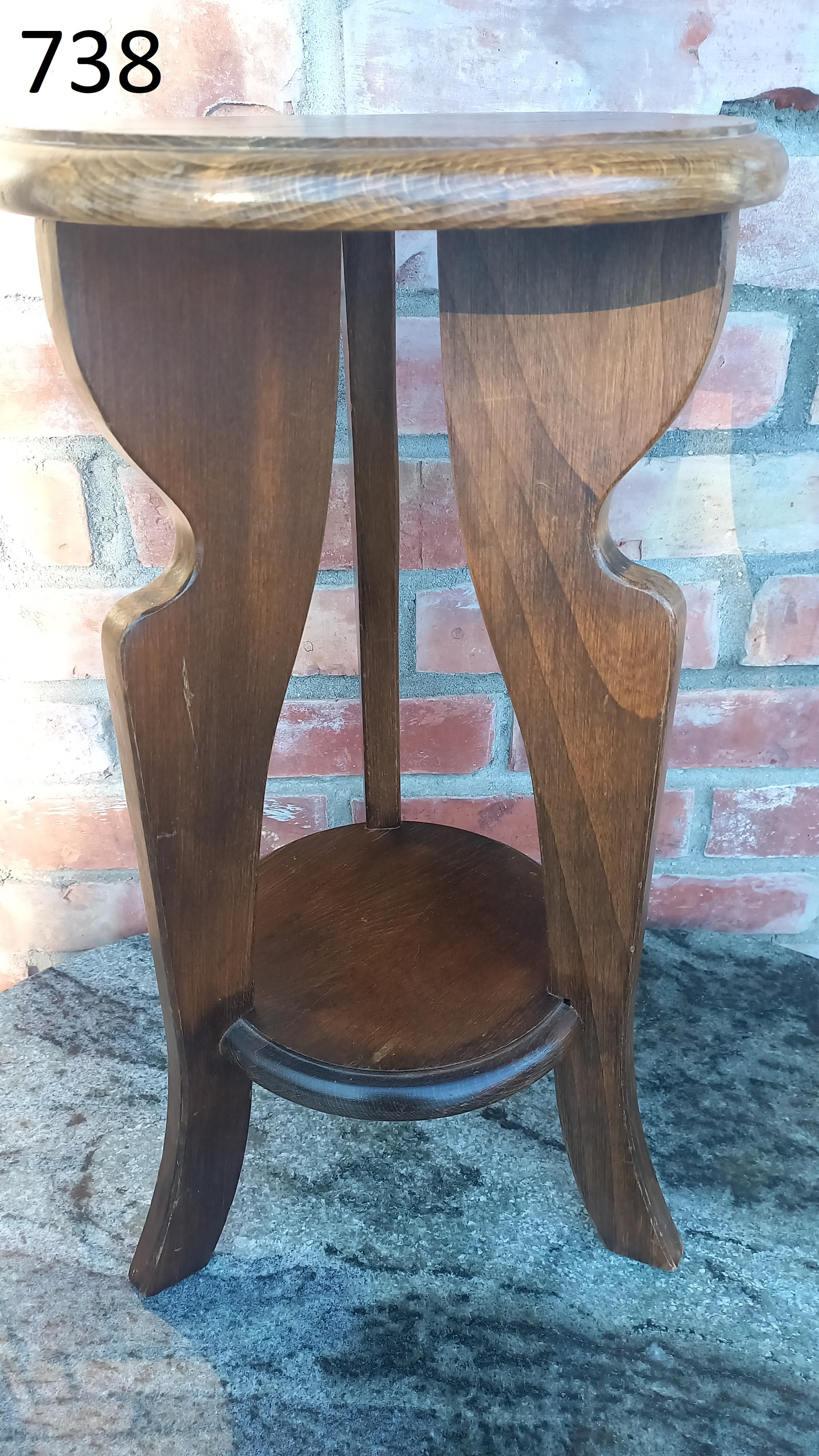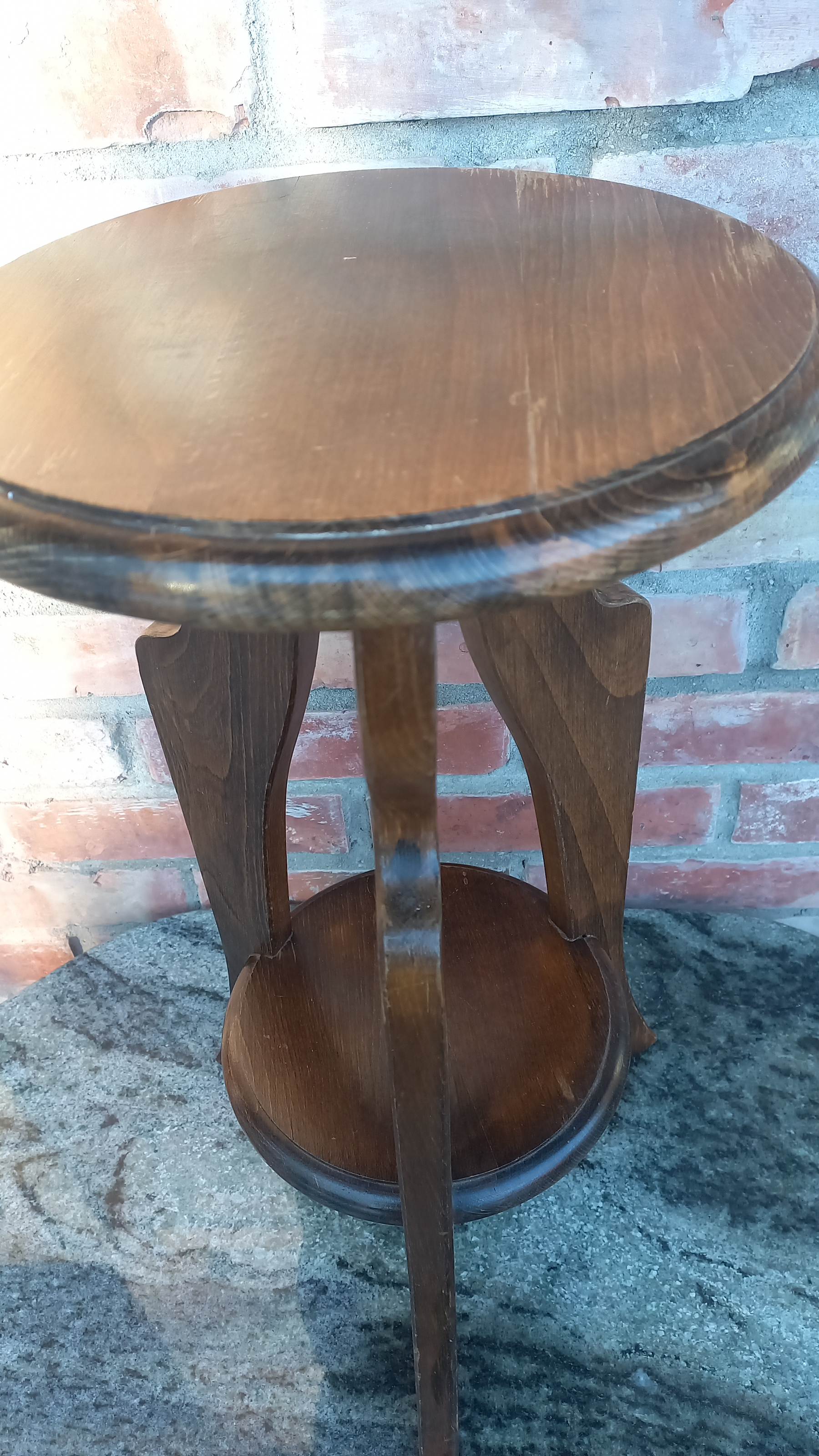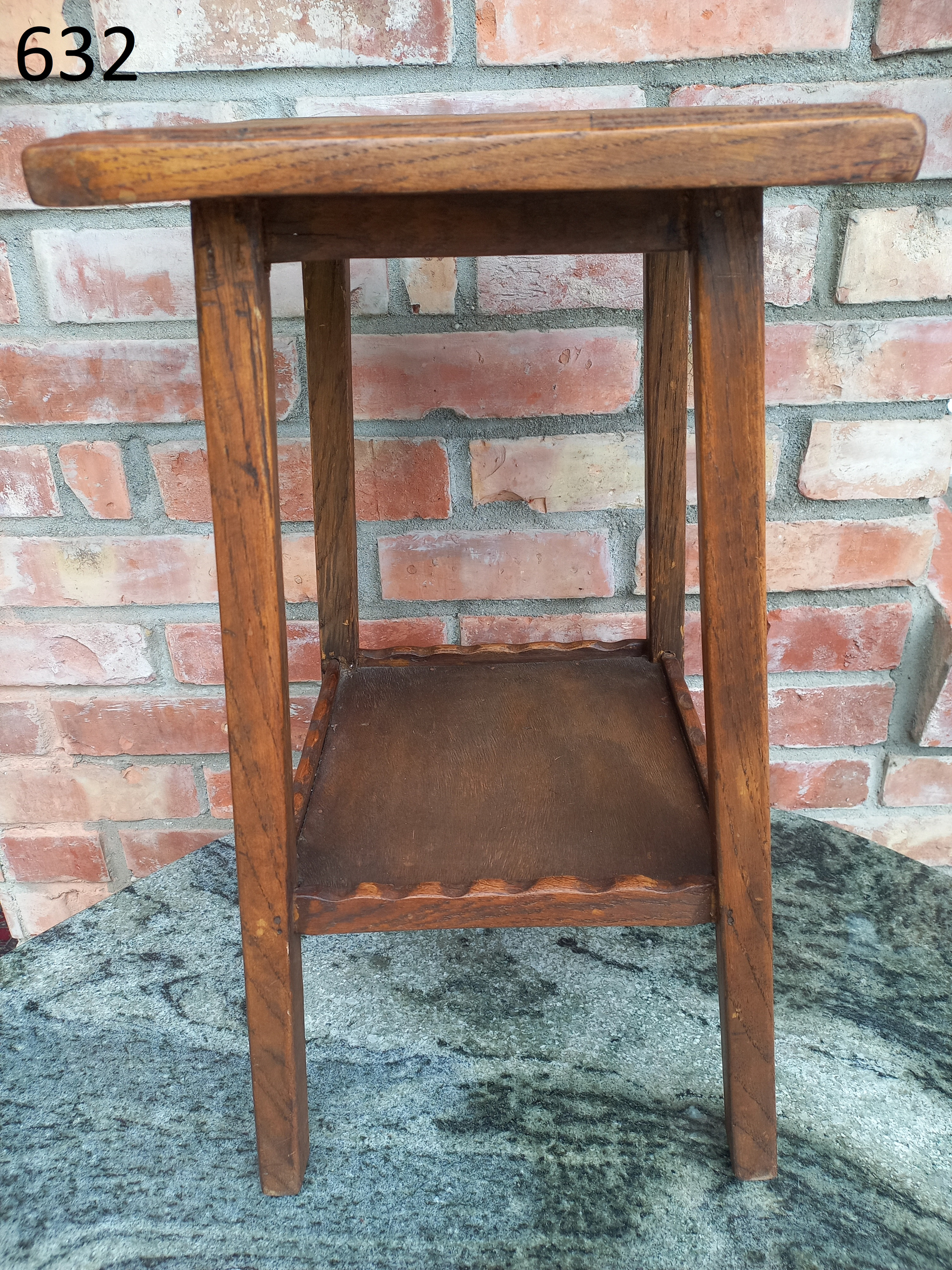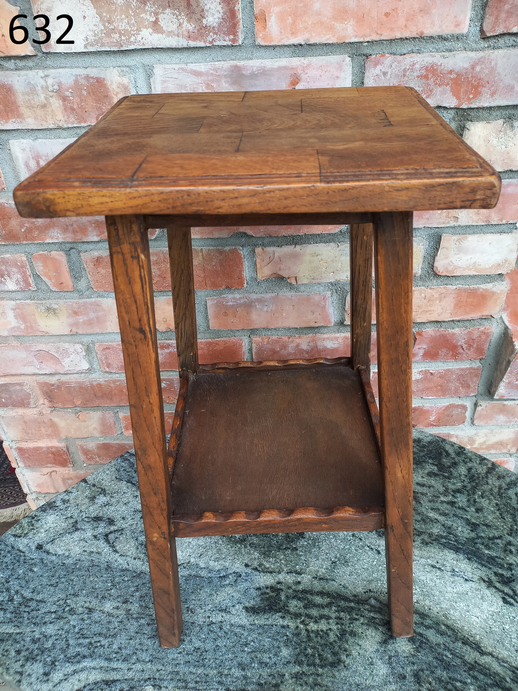 Mały stolik wykonany z drewna oraz płyty stolarskiej fornirowanej. Na meblu widnieją niewielkie ślady użytkowania takie jak przetarcia i ryski.