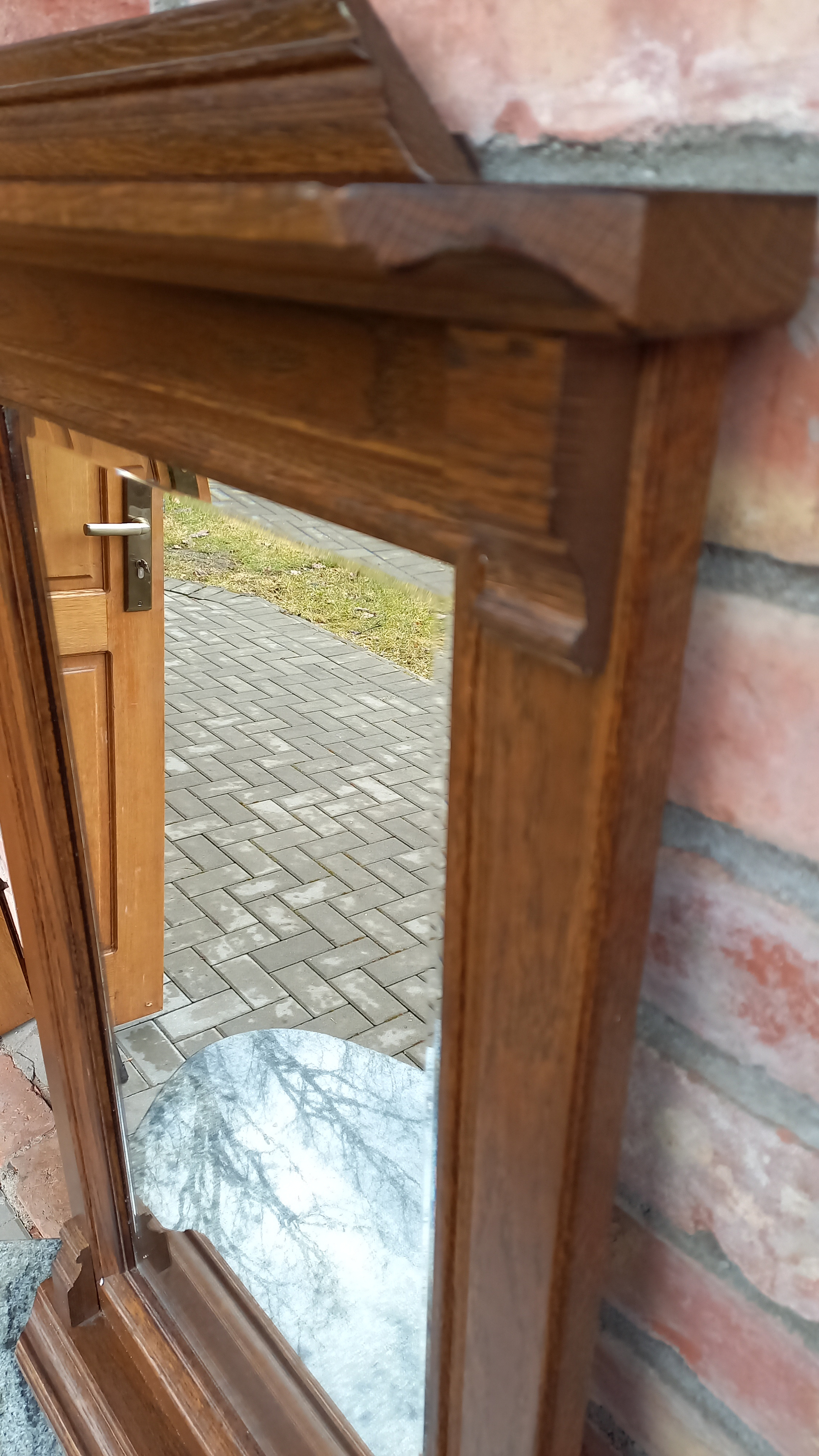 Lustro ścienne oprawione w drewnianą ramę.