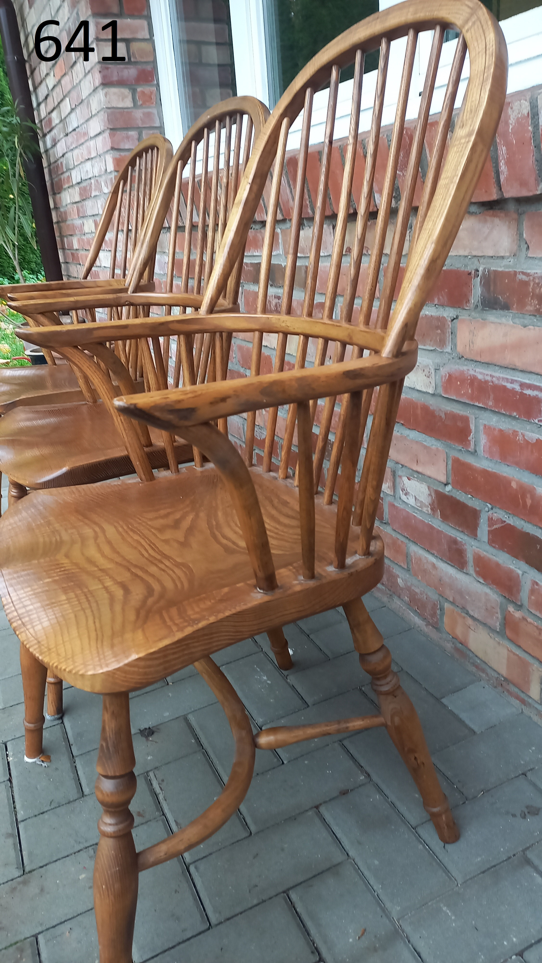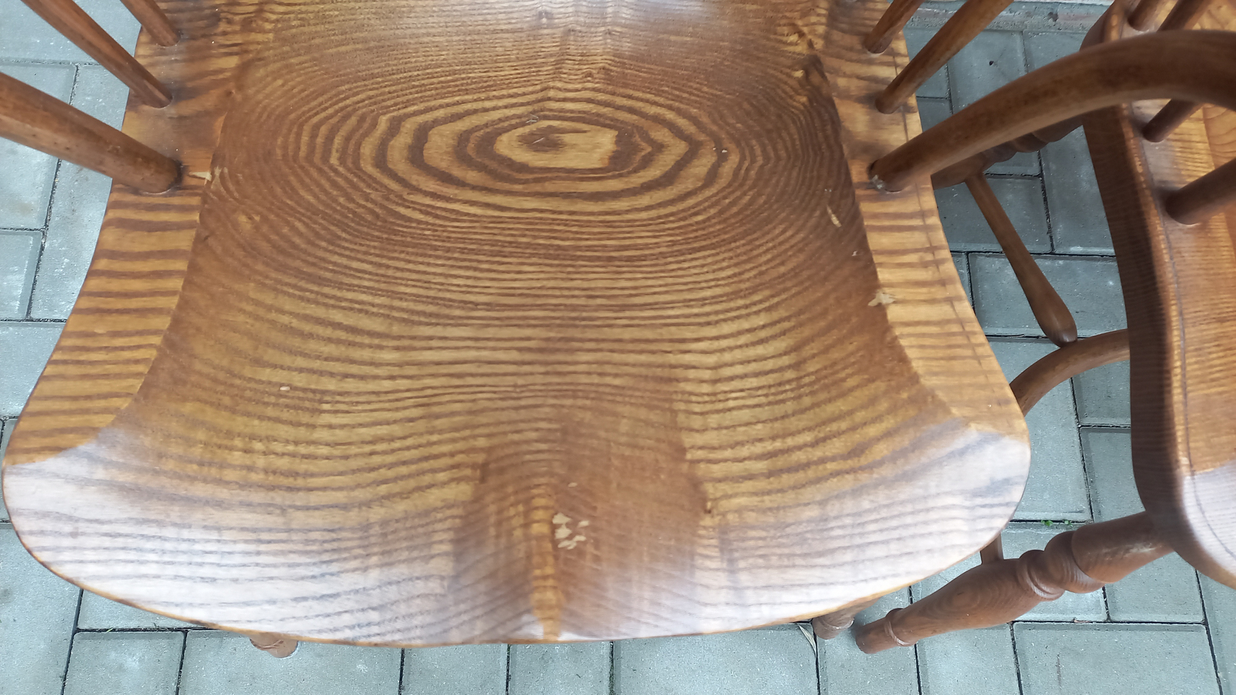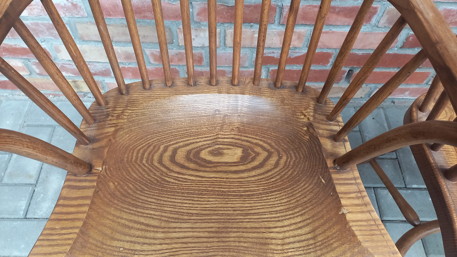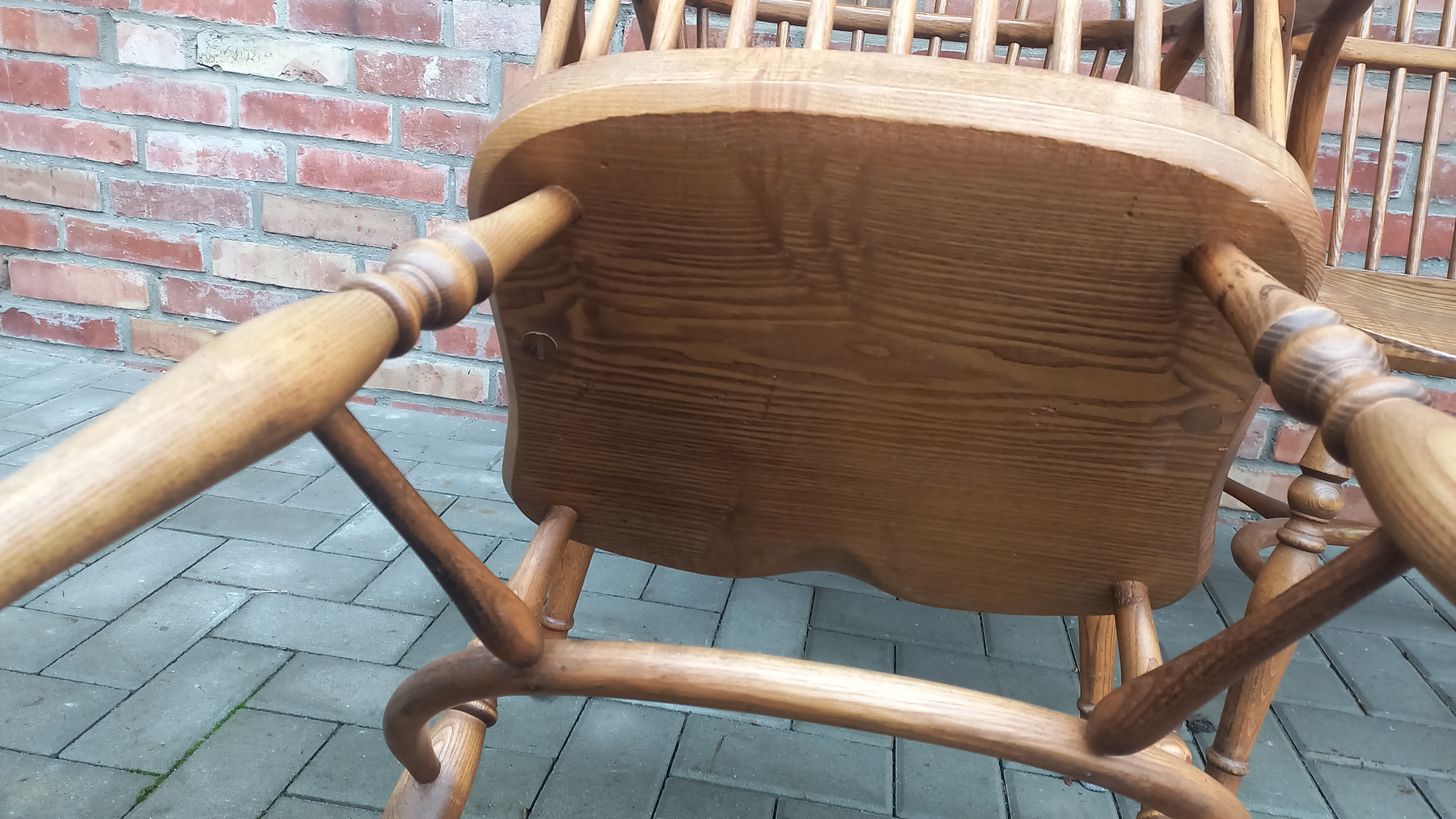 Drewniane stelaże są stabilne i sztywne z niewielkimi śladami użytkowania w postaci przetarć i rysek. Fotele w sprzedaży bez poduszek.
