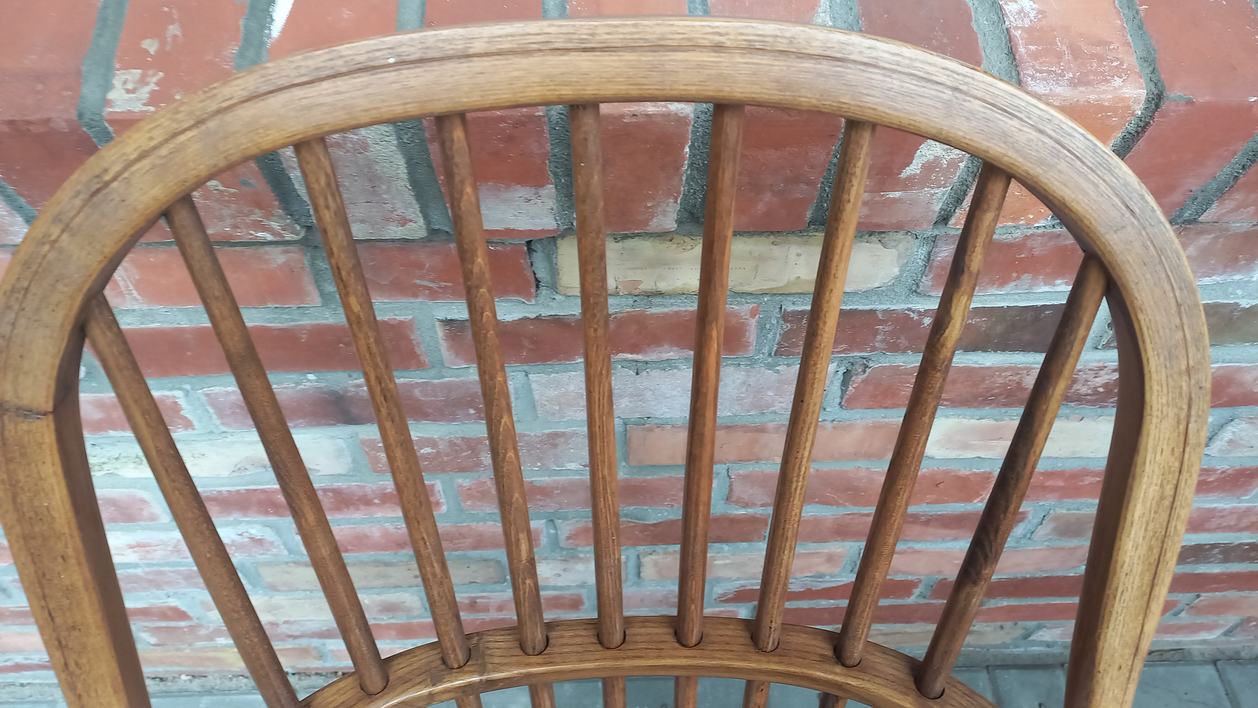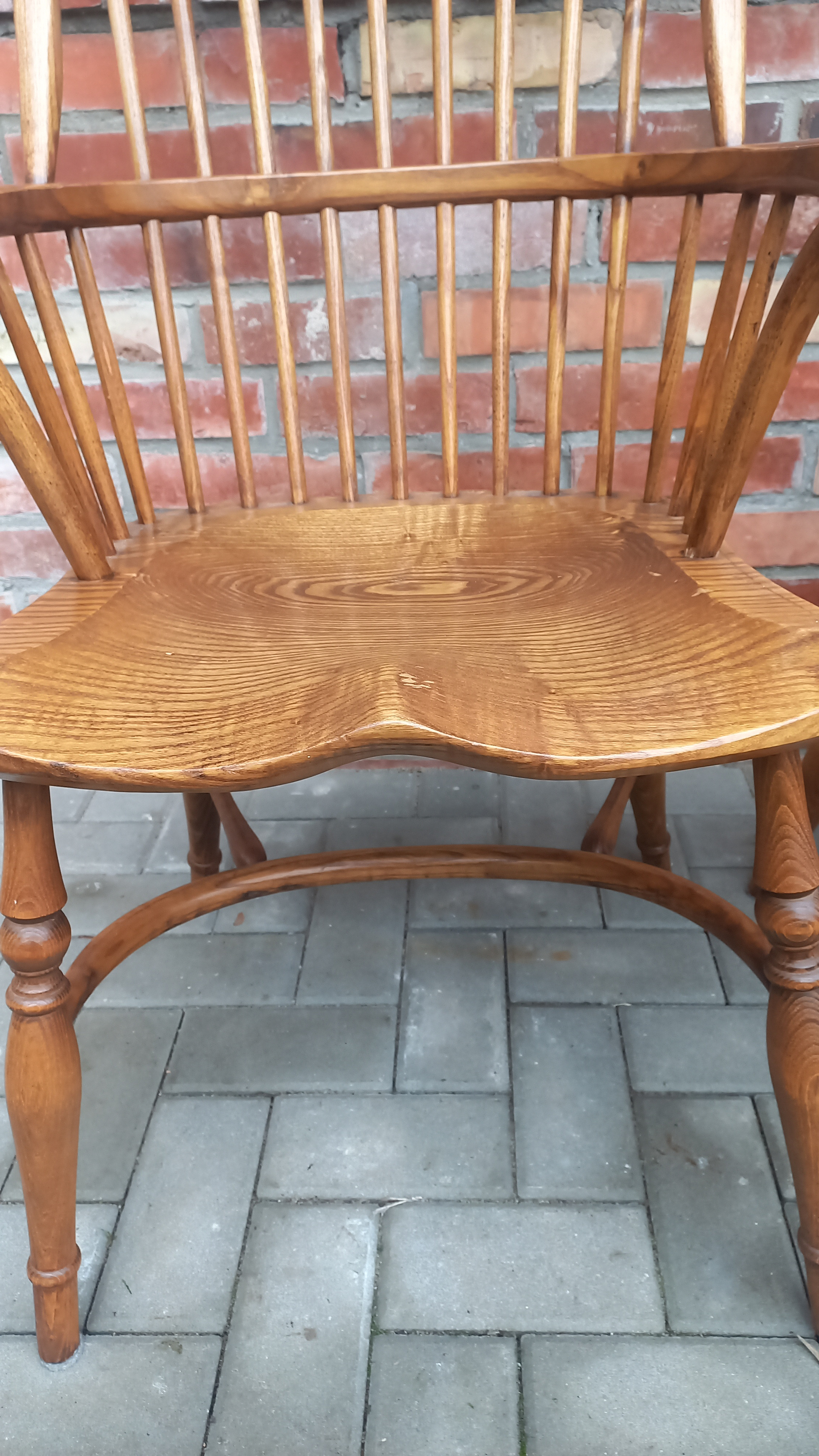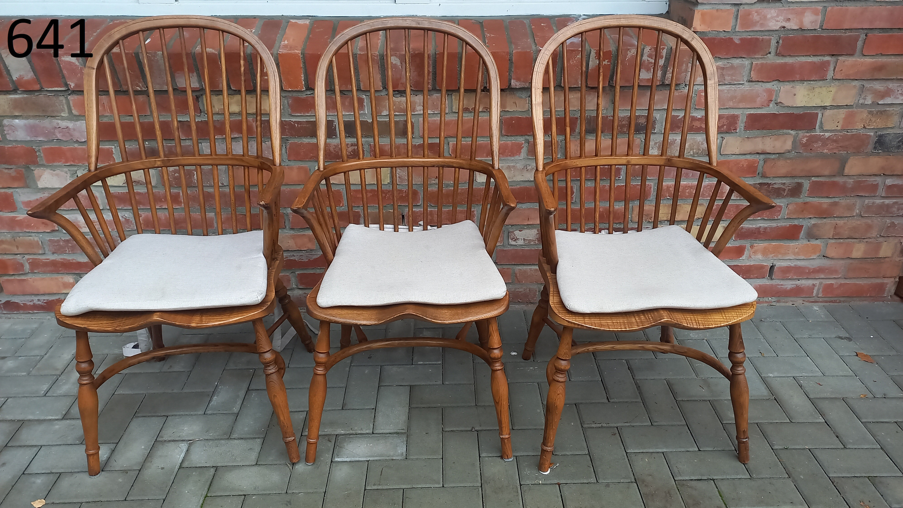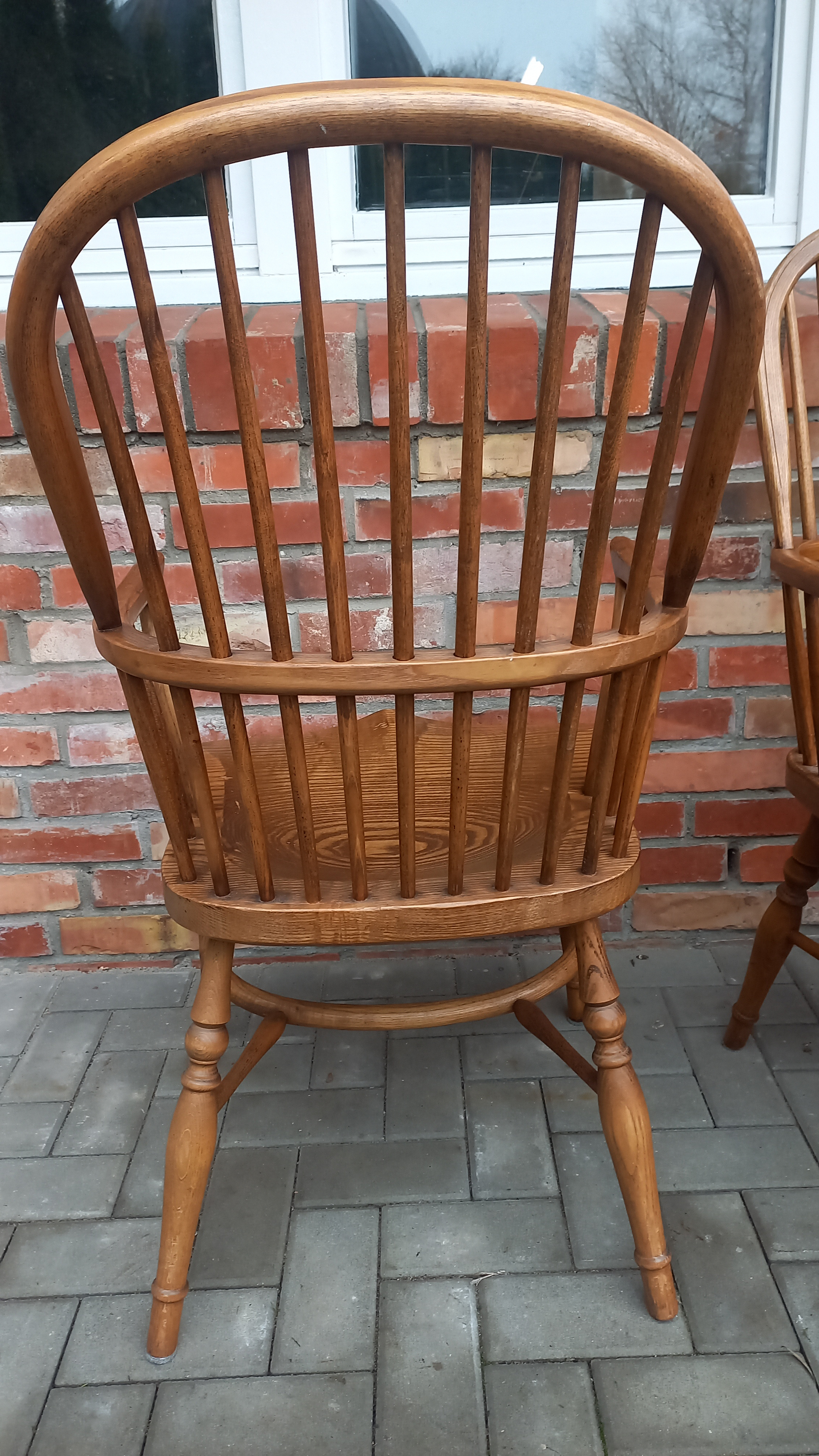 Drewniane stelaże są stabilne i sztywne z niewielkimi śladami użytkowania w postaci przetarć i rysek. Fotele w sprzedaży bez poduszek.