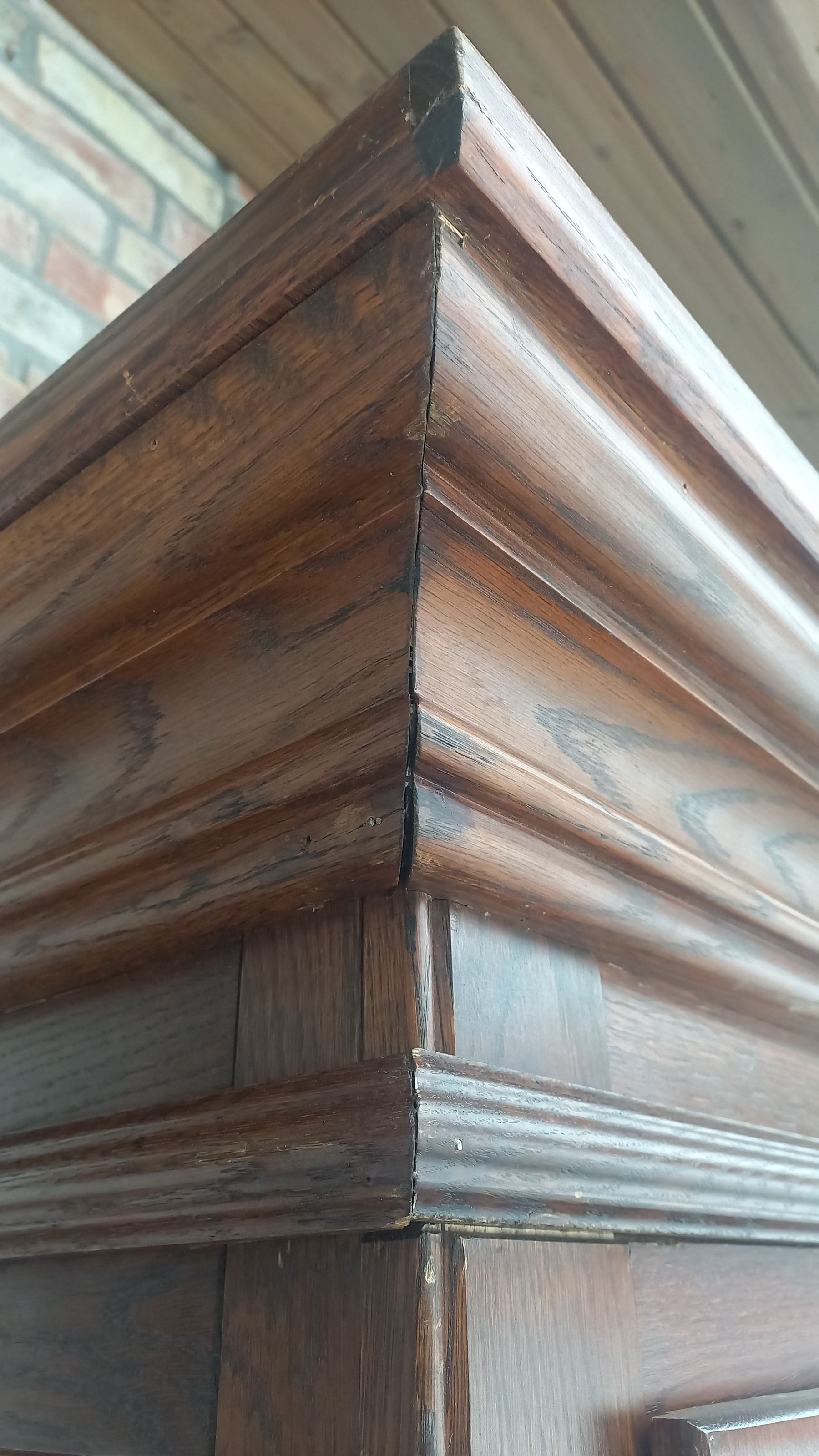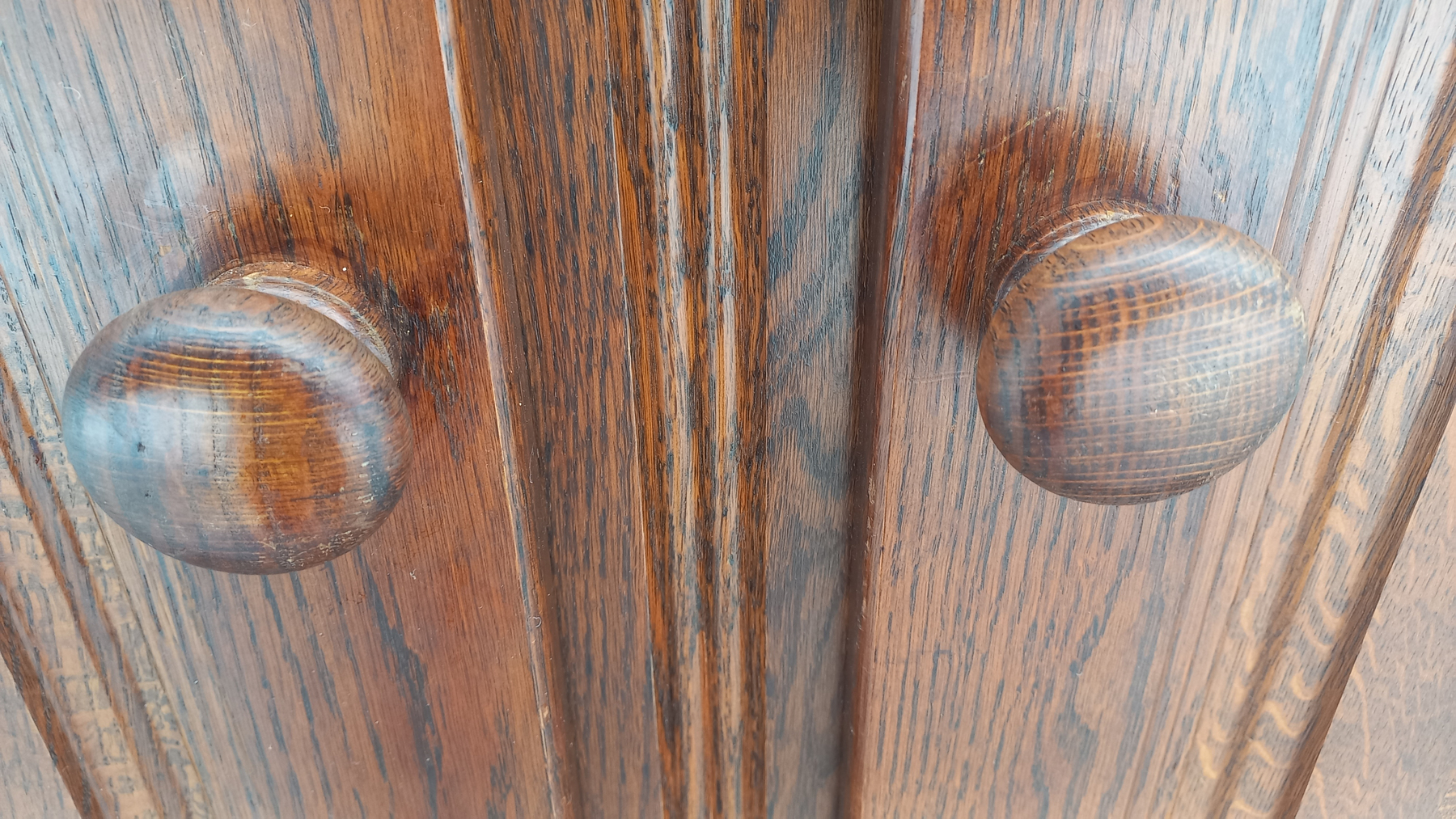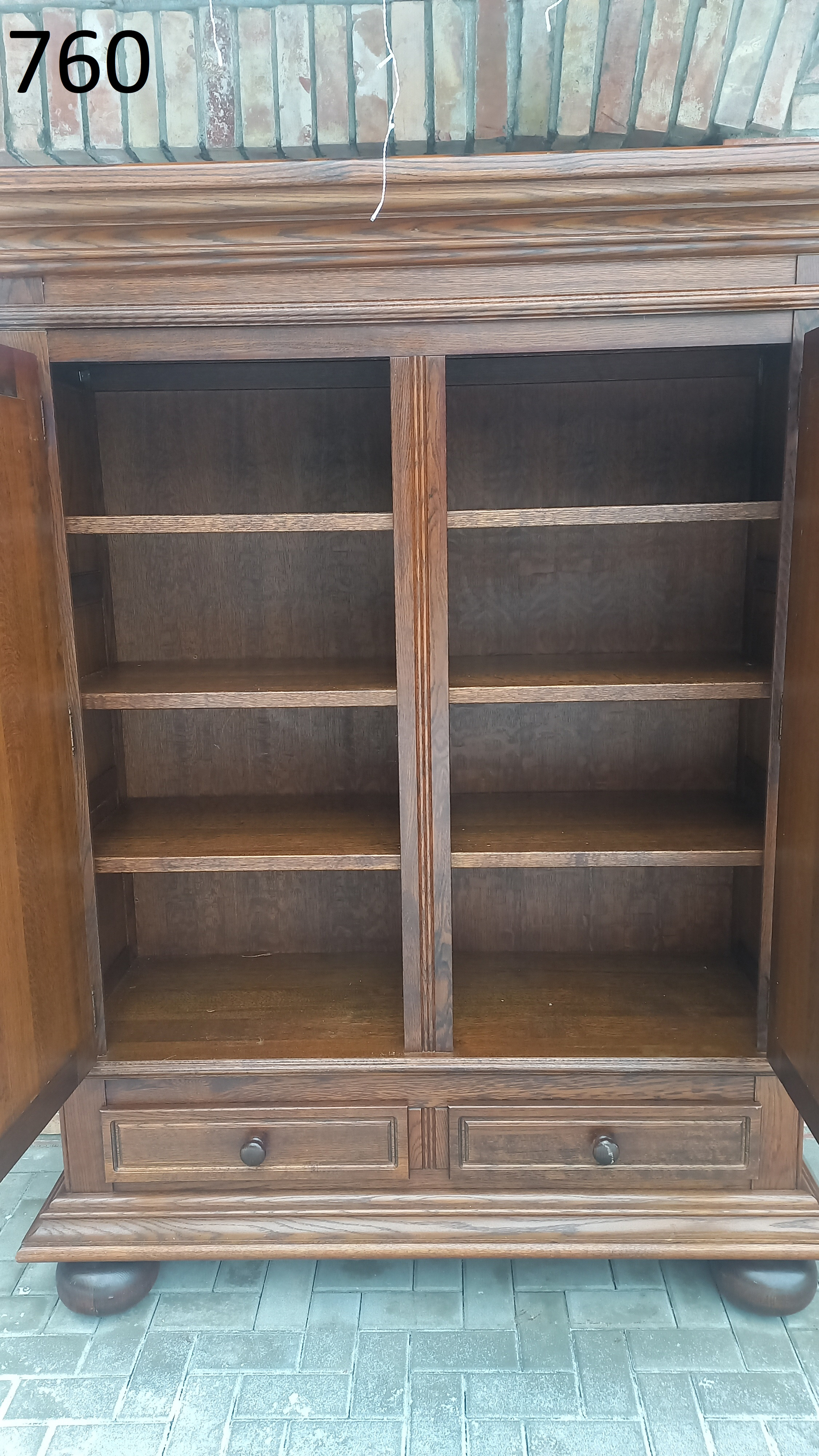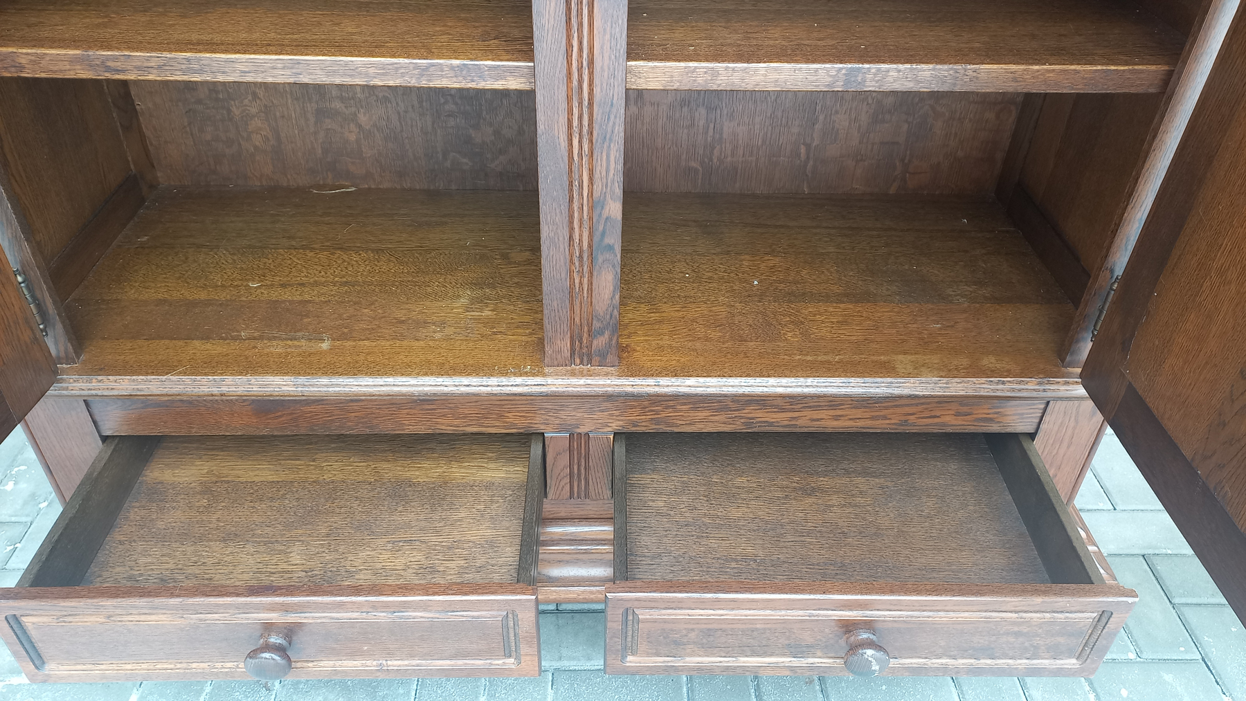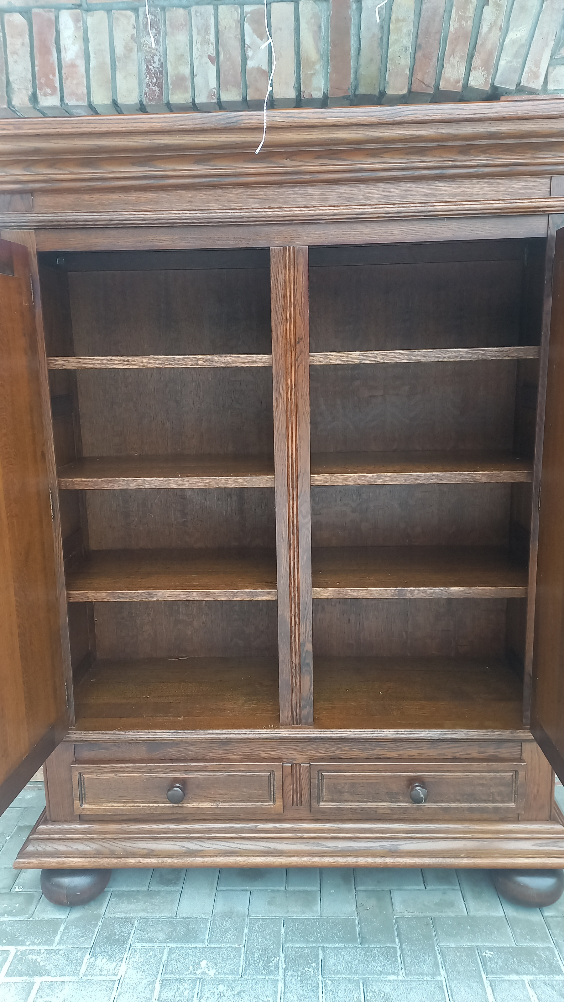 Szafa wykonana z drewna dębowego oraz płyty stolarskiej fornirowanej. Szafa dwudrzwiowa z półkami i szufladami.