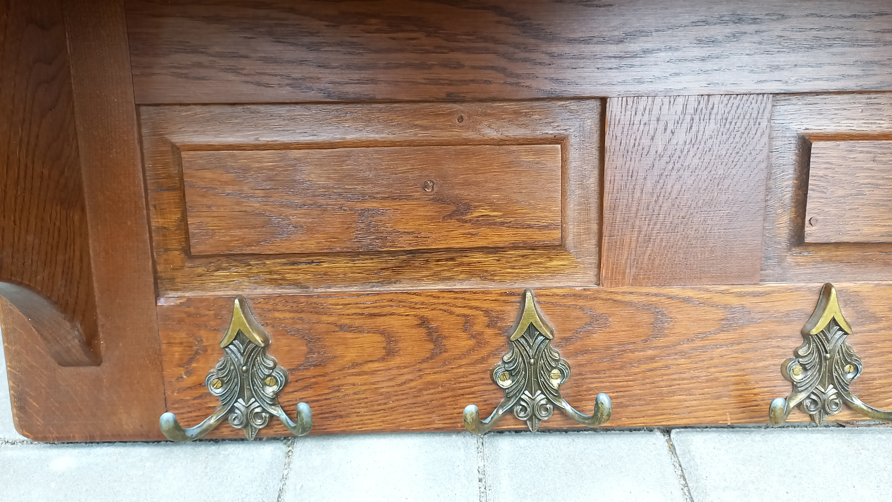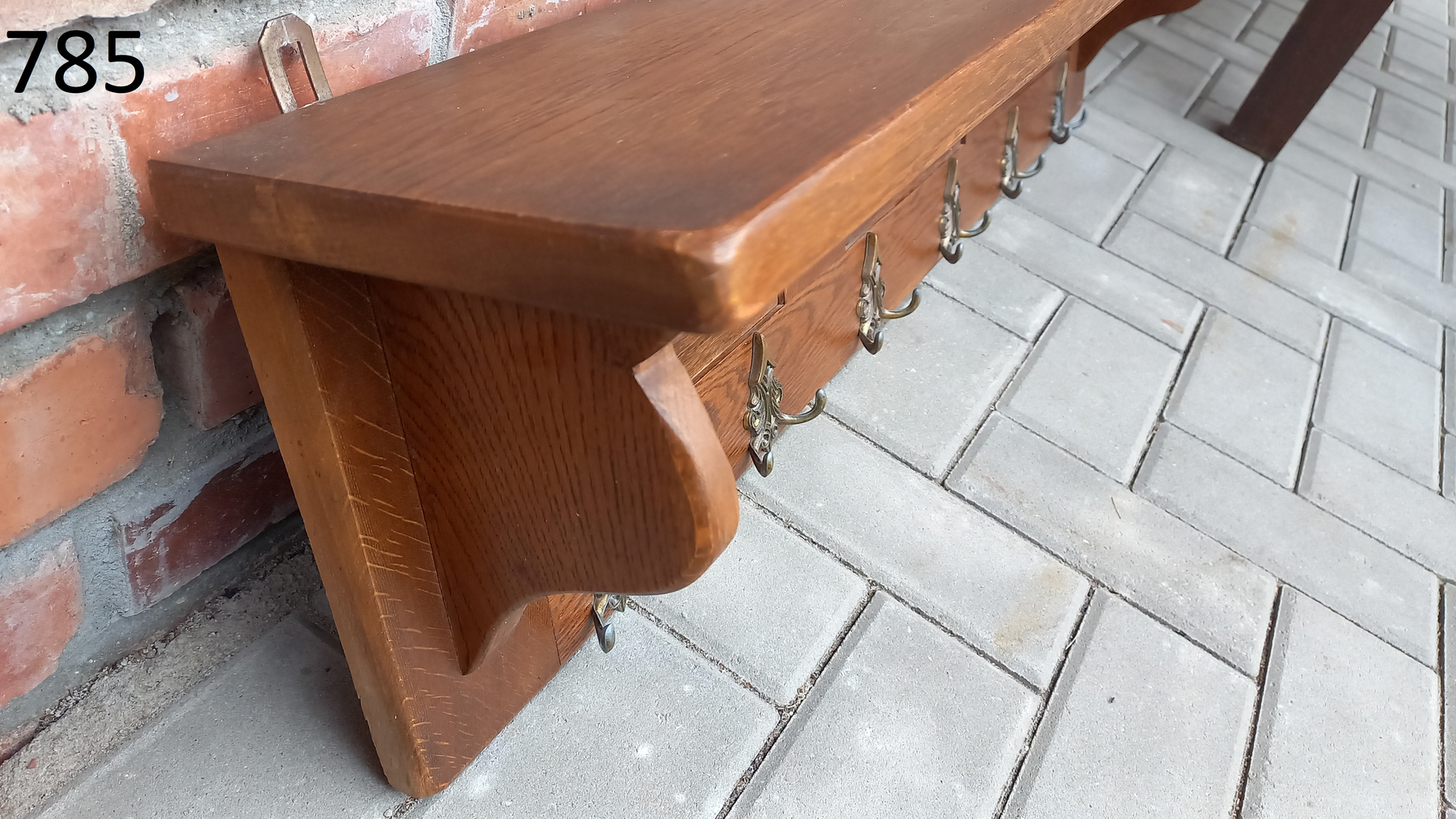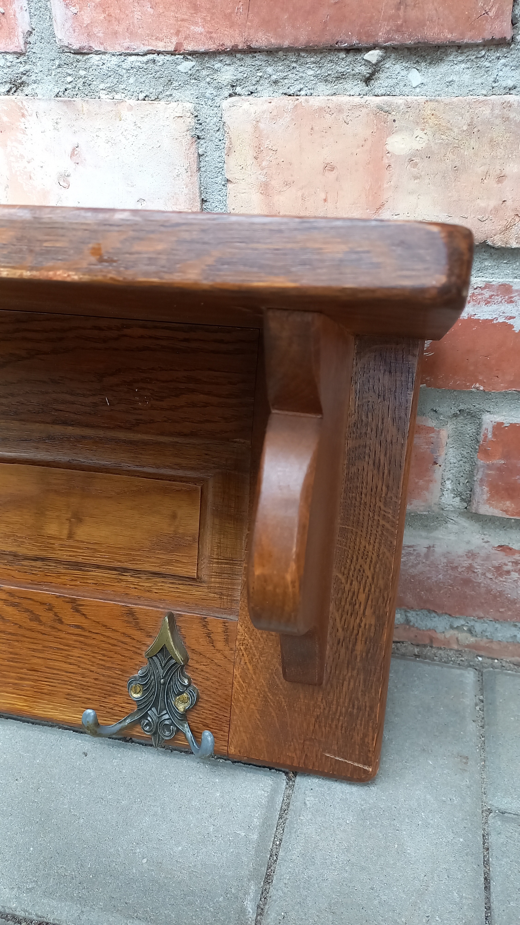 Wieszak ścienny wykonany z drewna dębowego oraz sklejki.