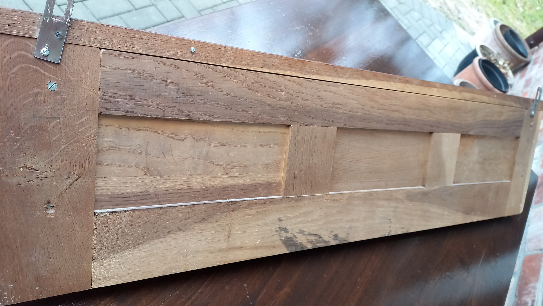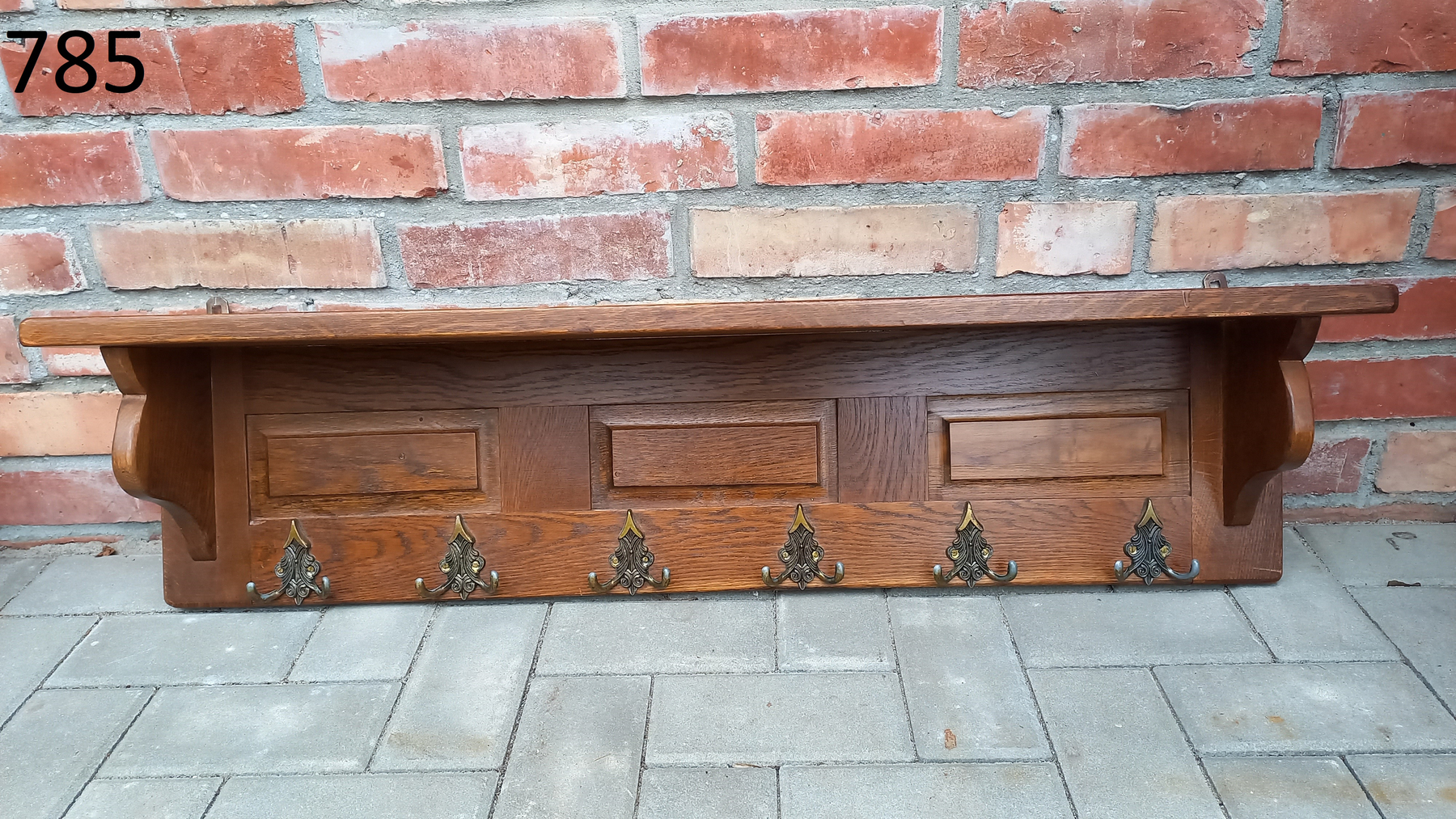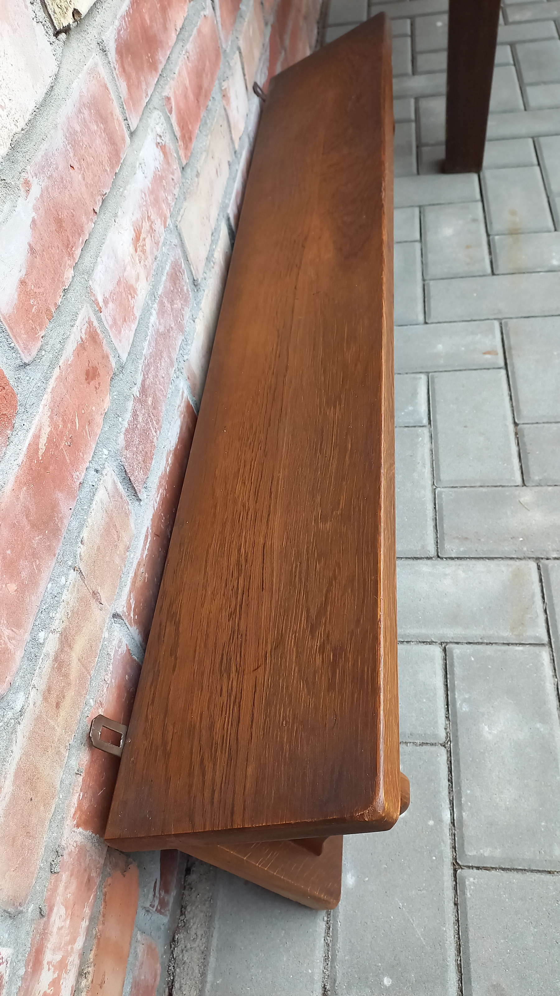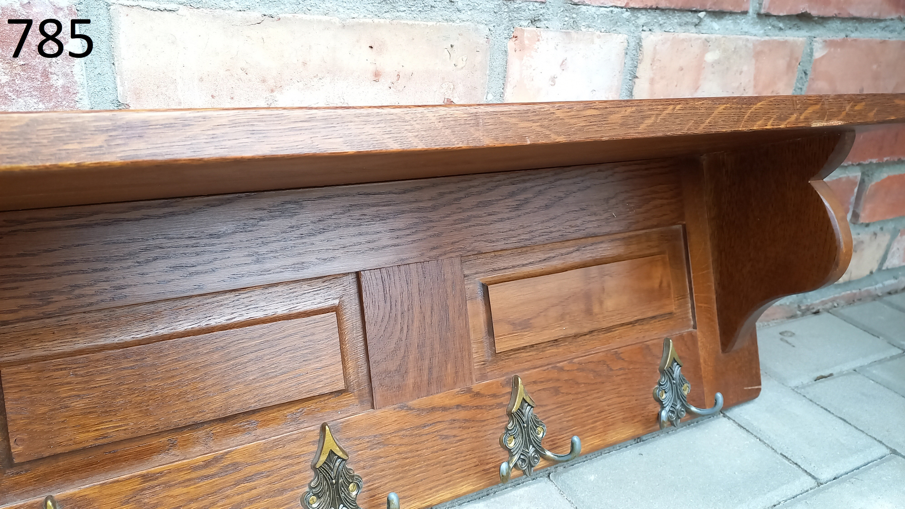 Wieszak ścienny wykonany z drewna dębowego oraz sklejki.