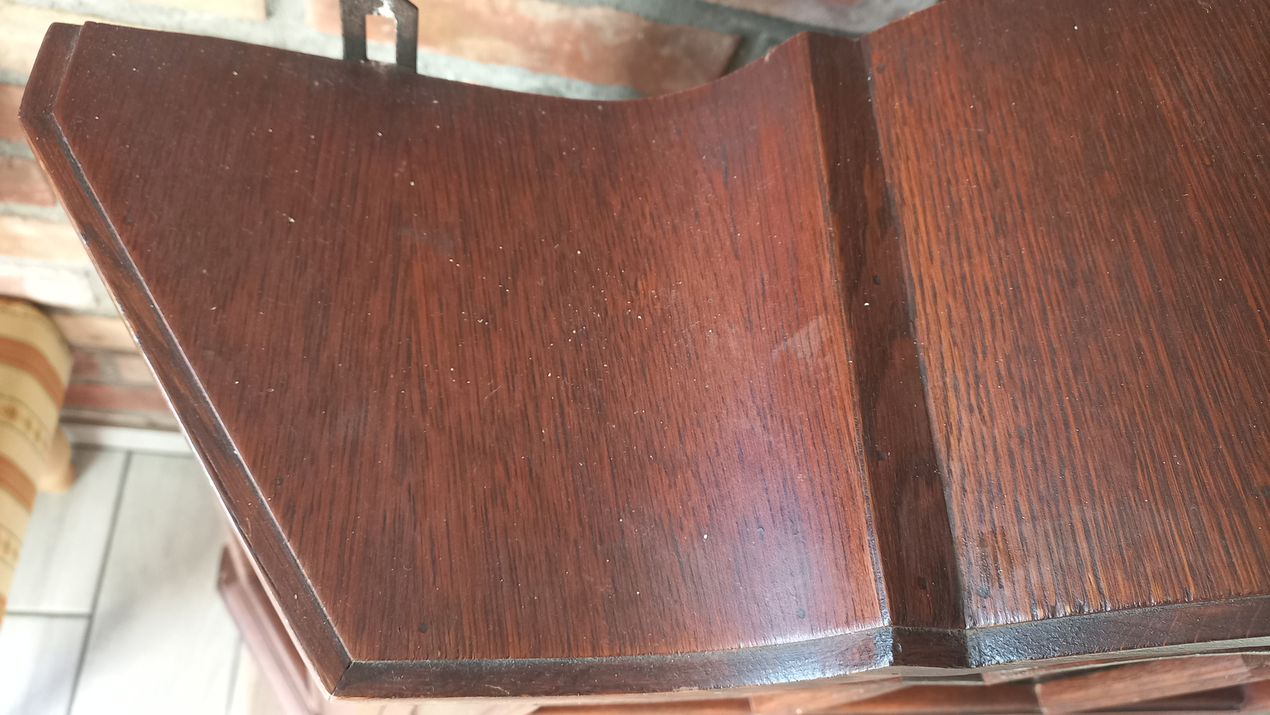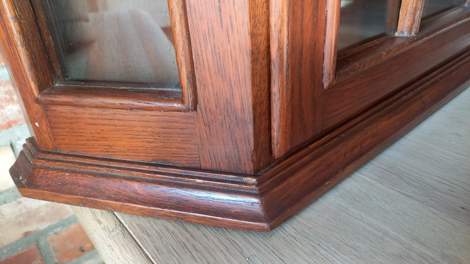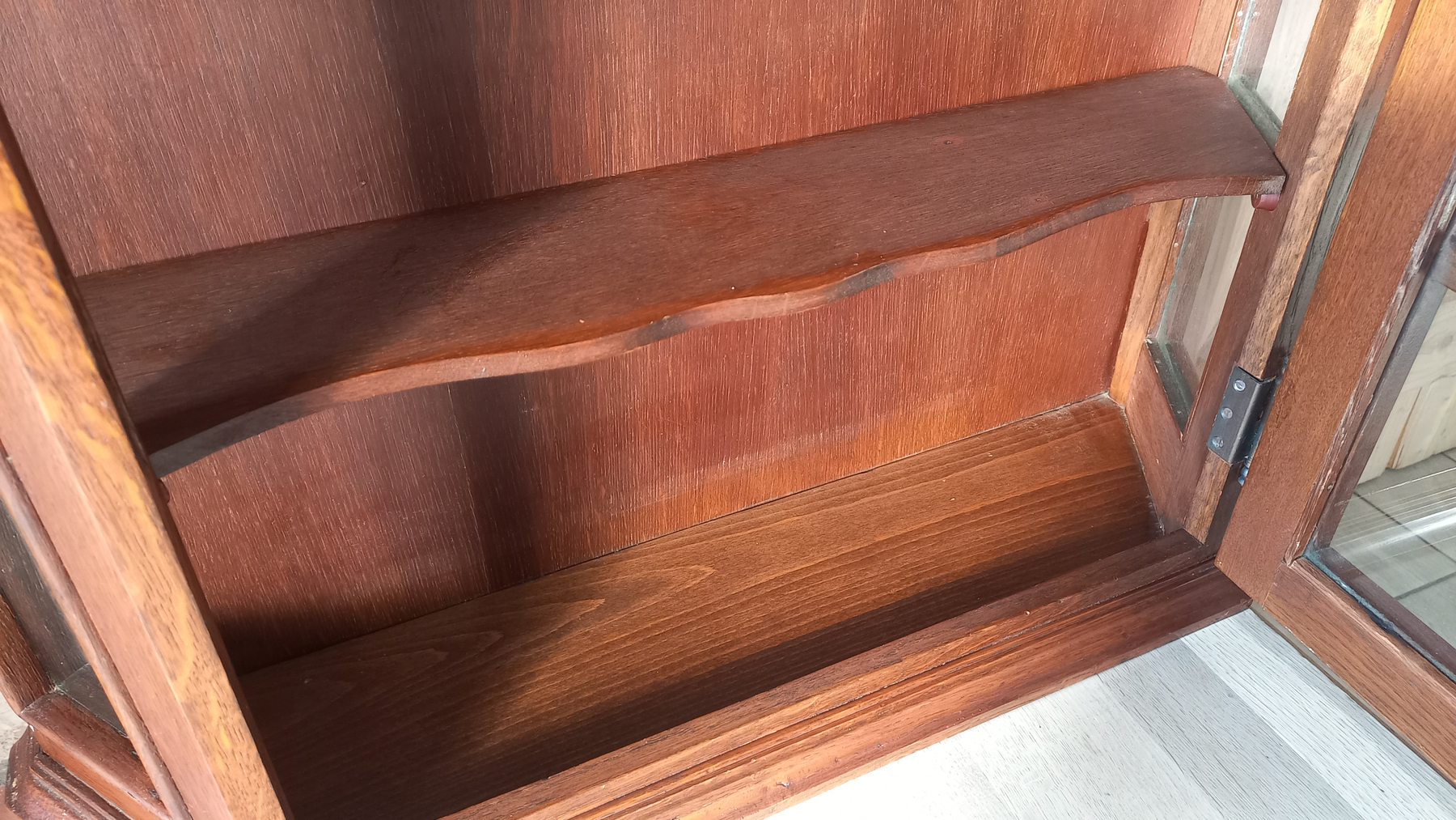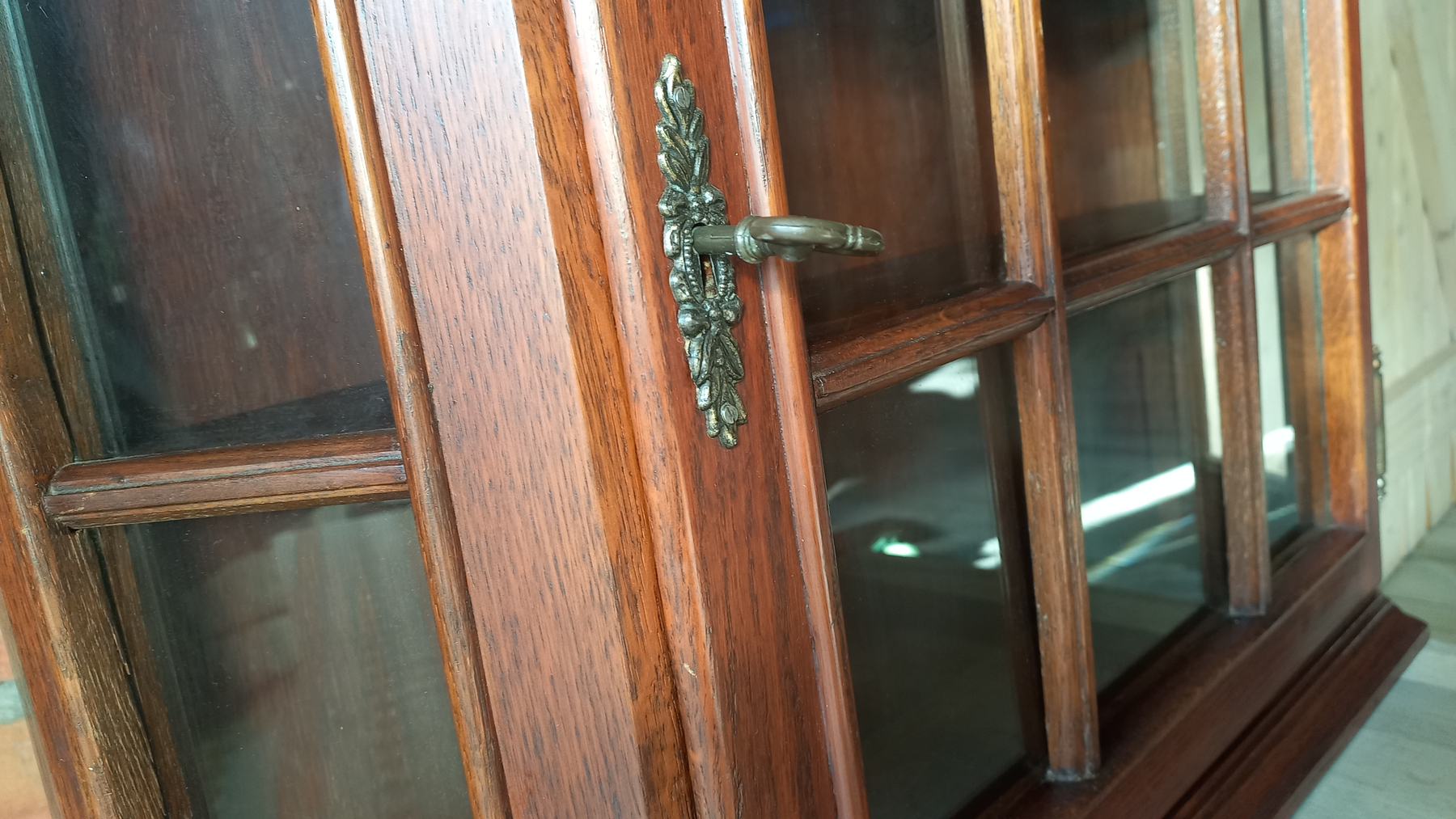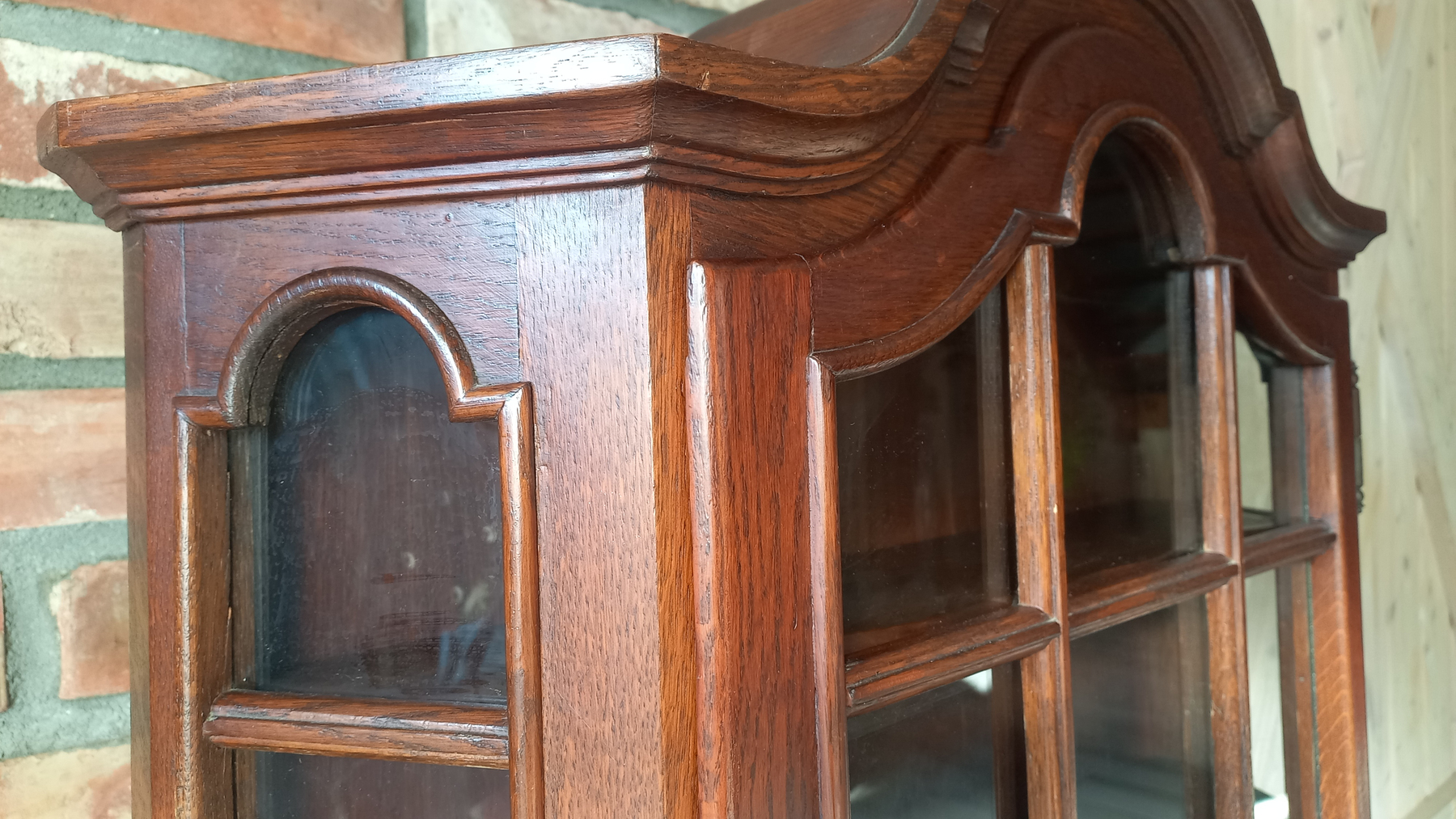 Witrynka wisząca wykonana z drewna oraz sklejki fornirowanej.