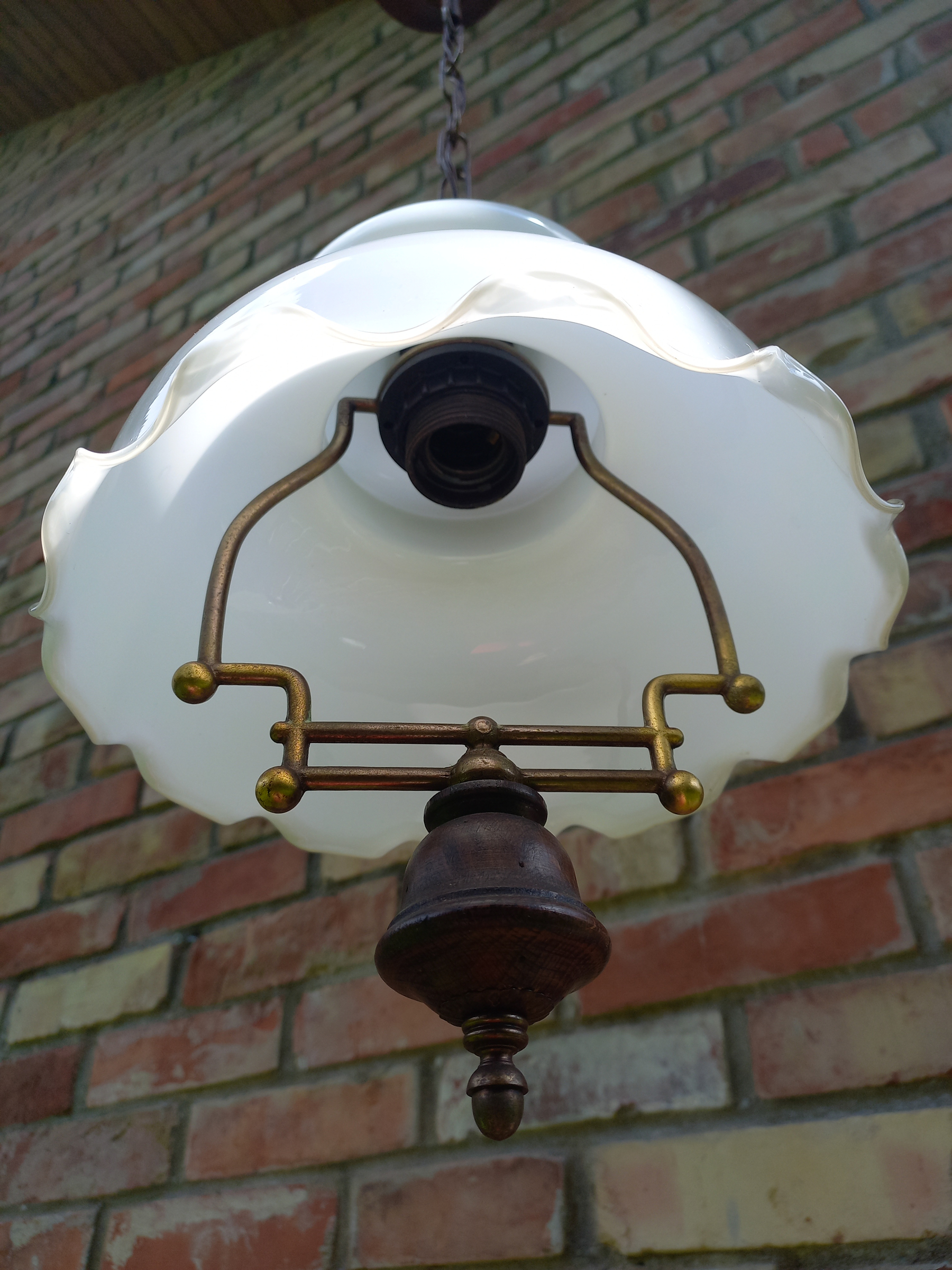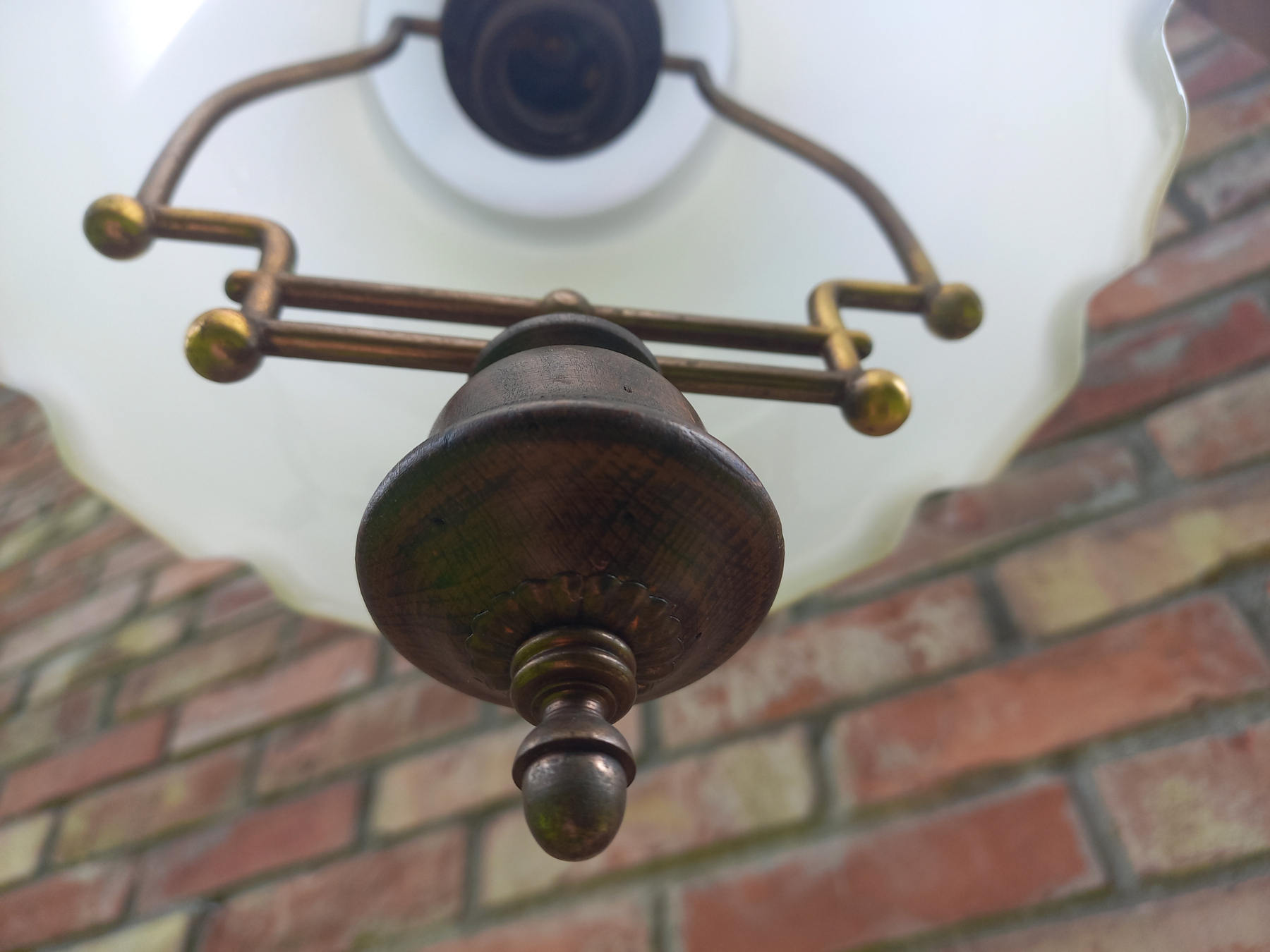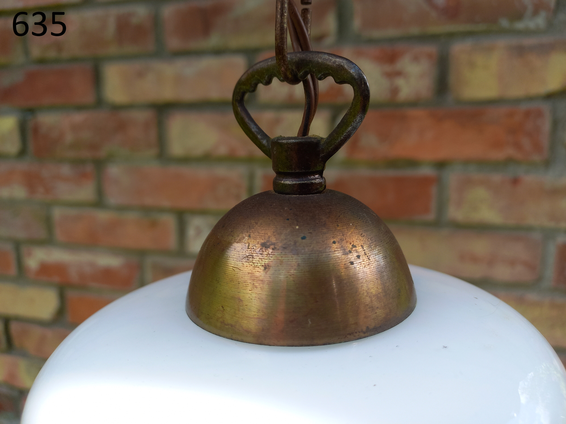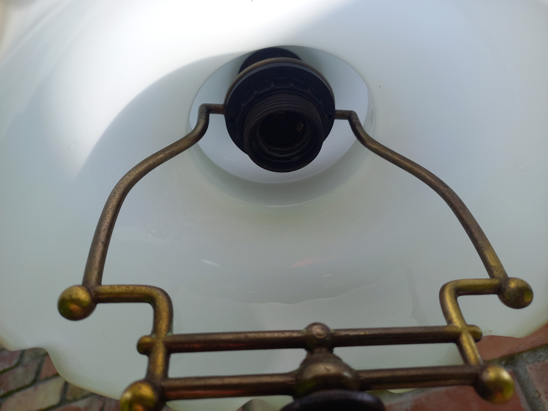 Instalacja elektryczna jest sprawna. Szklany klosz jest cały. Na metalu widnieją niewielkie ślady upływu czasu. Osłonka przy żarówce jest lekko pęknięta.