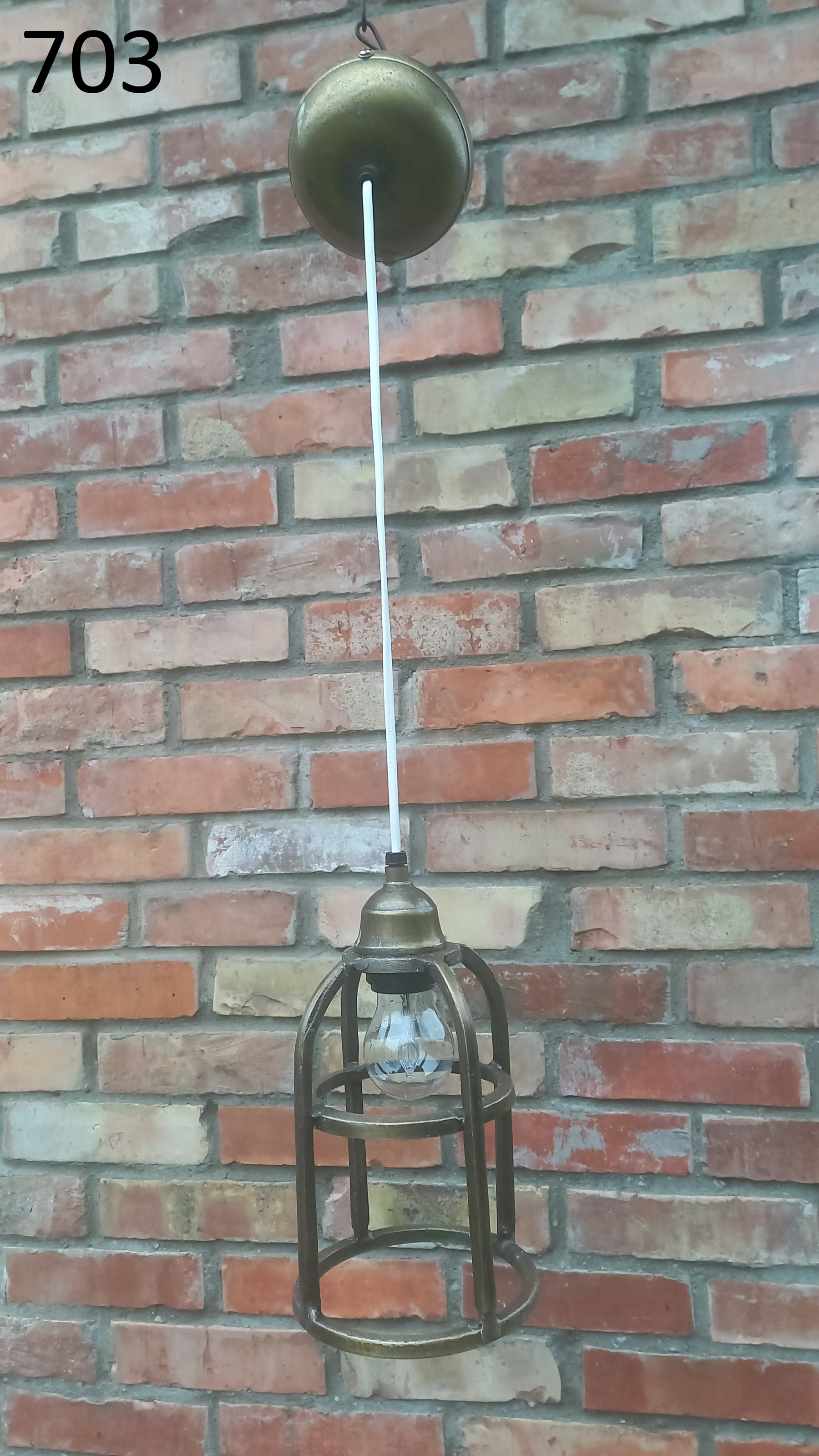 Żyrandol z metalowym kloszem. Mechanizm do regulacji wysokości jest sprawny. Na kloszu widnieją delikatne ślady upływu czasu. Instalacja elektryczna jest sprawna.