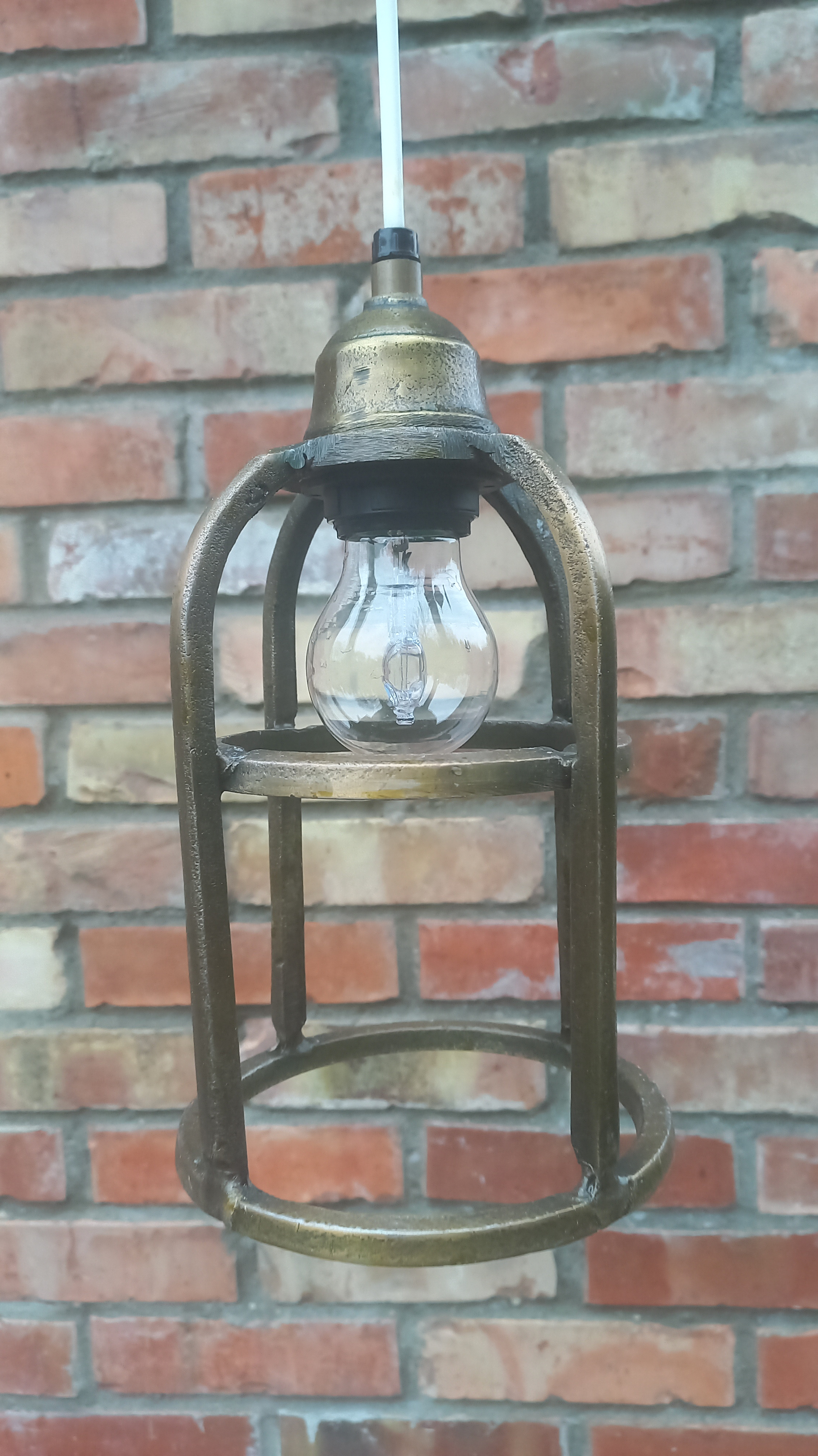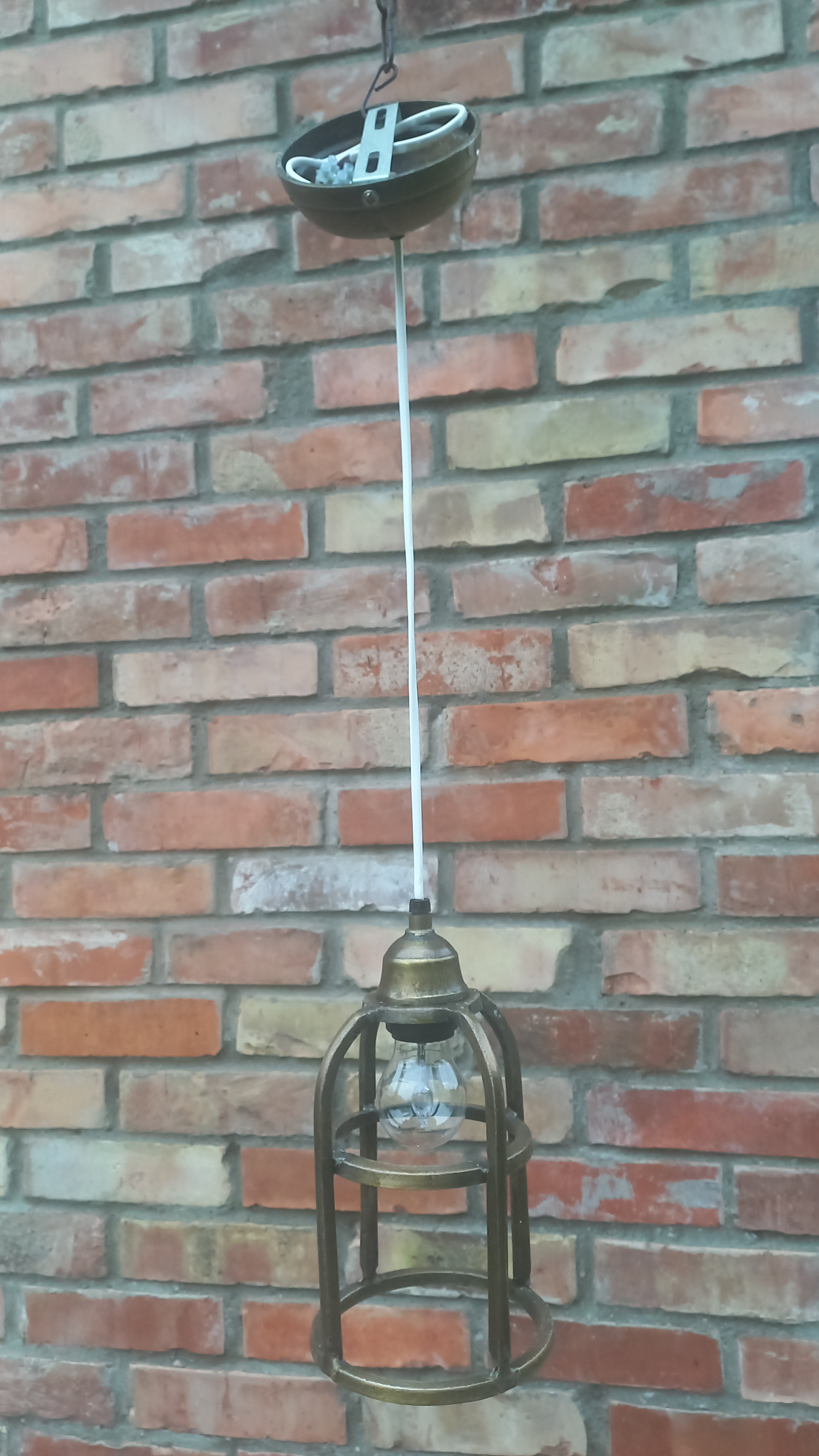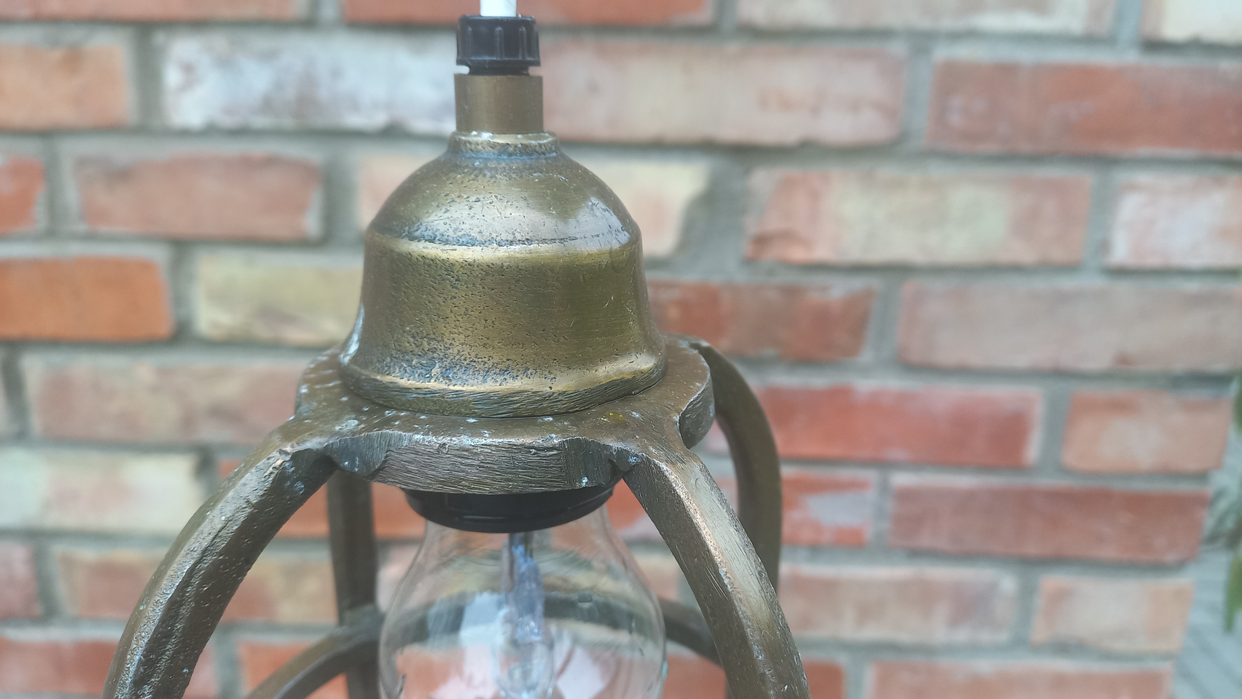 Instalacja elektryczna jest sprawna. Szklany klosz jest cały. Metal ze śladami użytkowania.