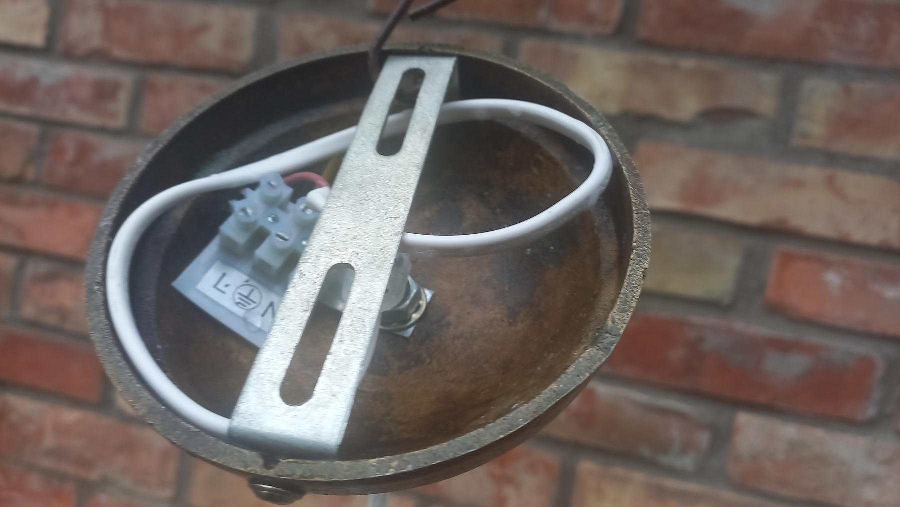 Instalacja elektryczna jest sprawna (w jednym miejscu jest łączony kabel). Klosze jest cały.