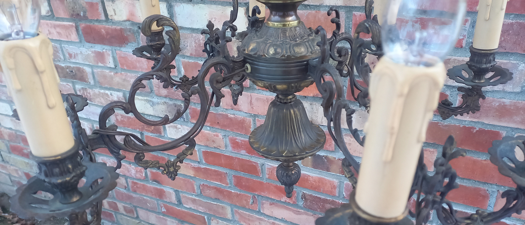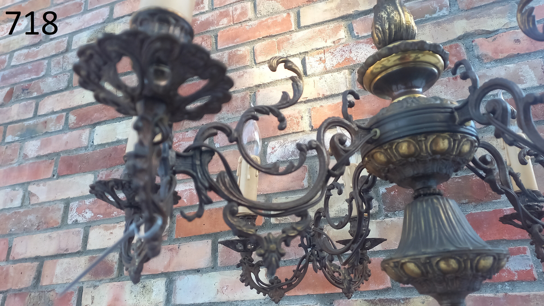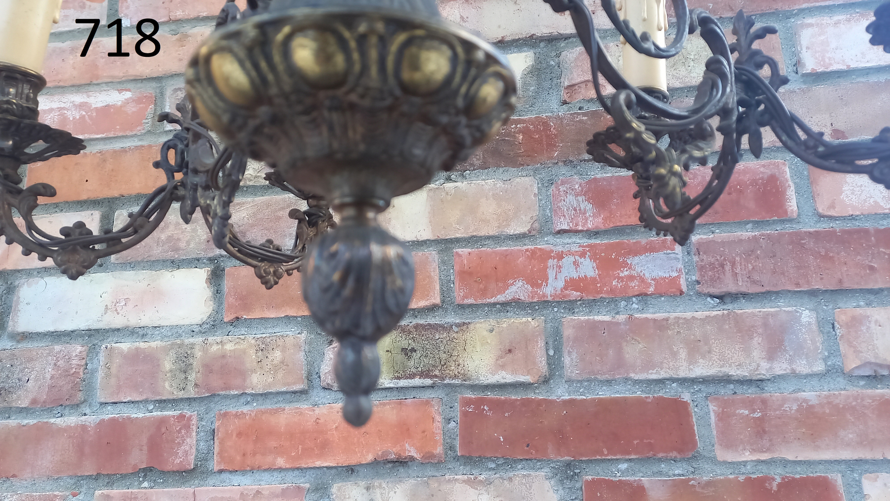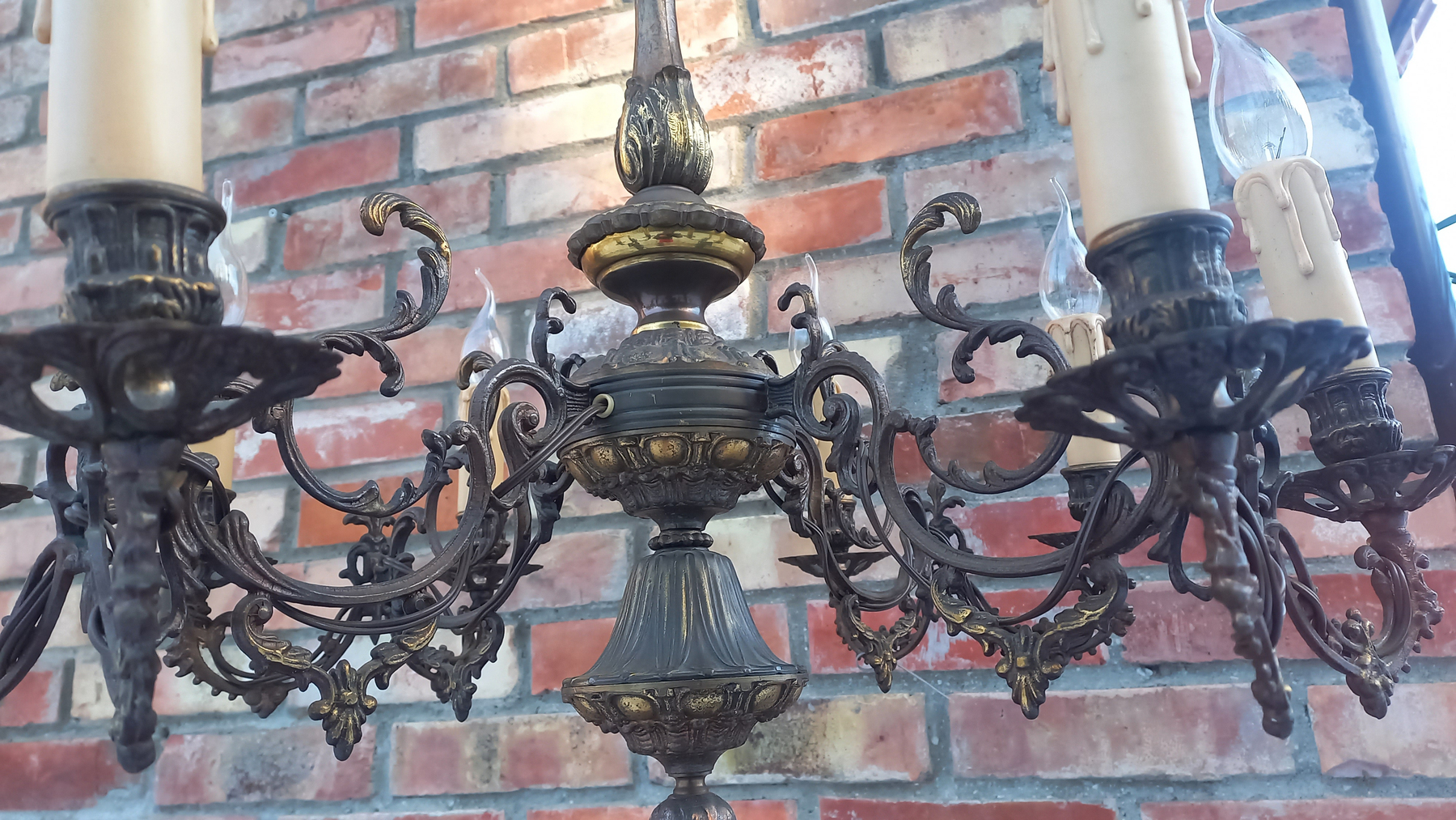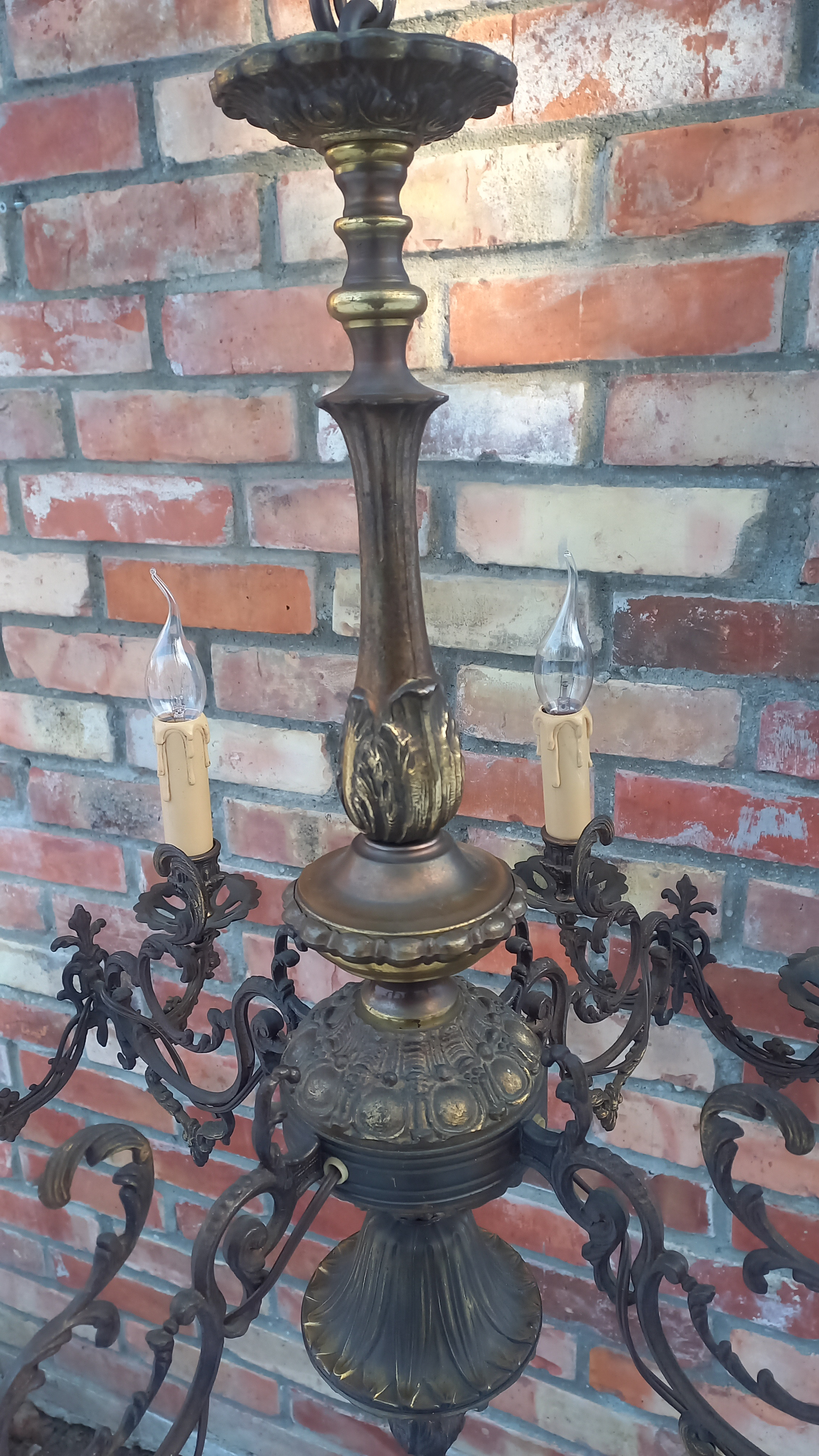 Na metalu widnieją niewielkie ślady upływu czasu. Instalacja elektryczna jest sprawna. Żyrandol jest bardzo ciężki. Żyrandol do wysyłki będzie częściowo rozkręcony.