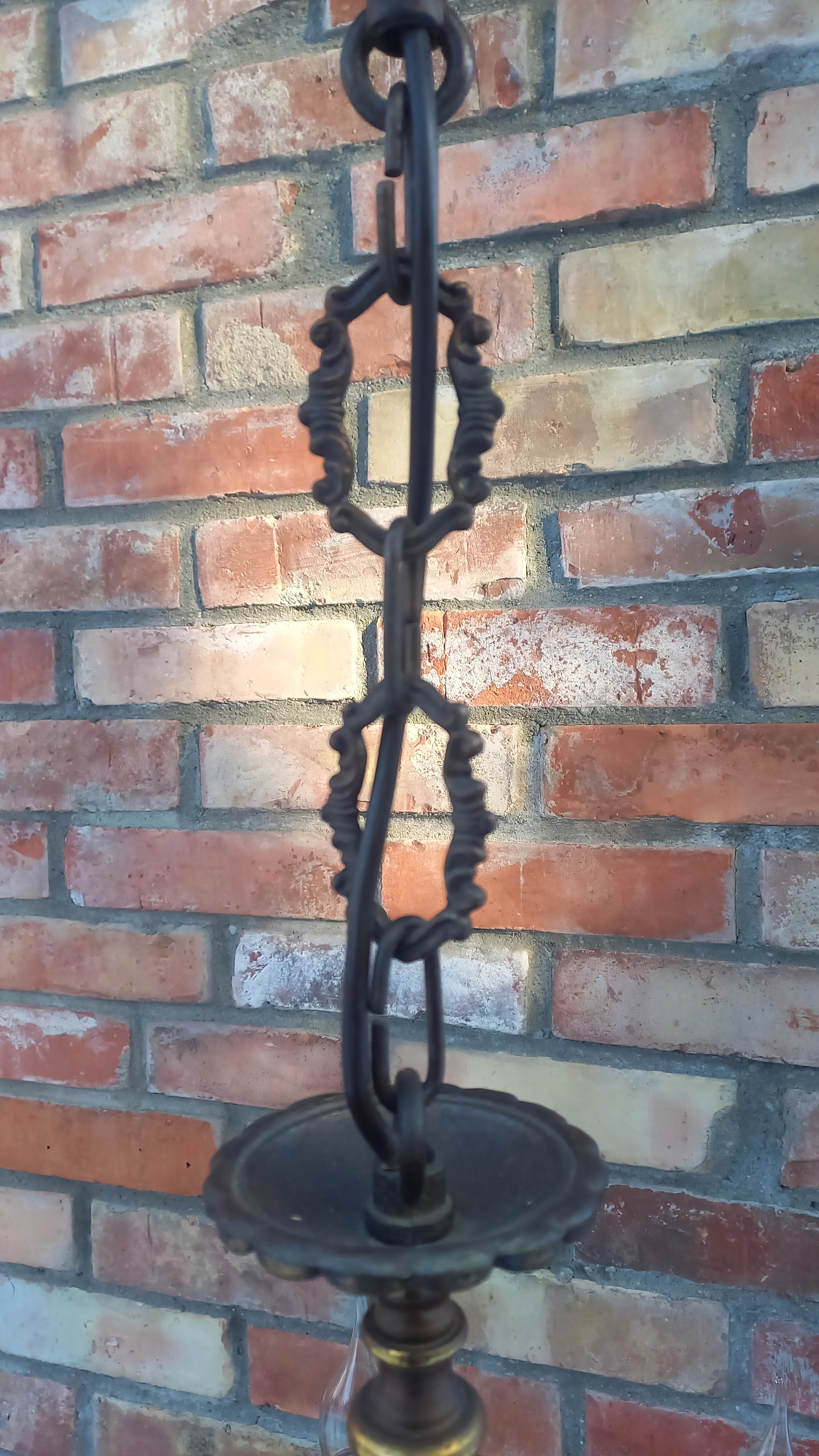 Żyrandol holenderski ze szklanym kloszem. Mechanizm do regulacji wysokości jest sprawny. Klosz jest cały. Instalacja elektryczna jest sprawna.